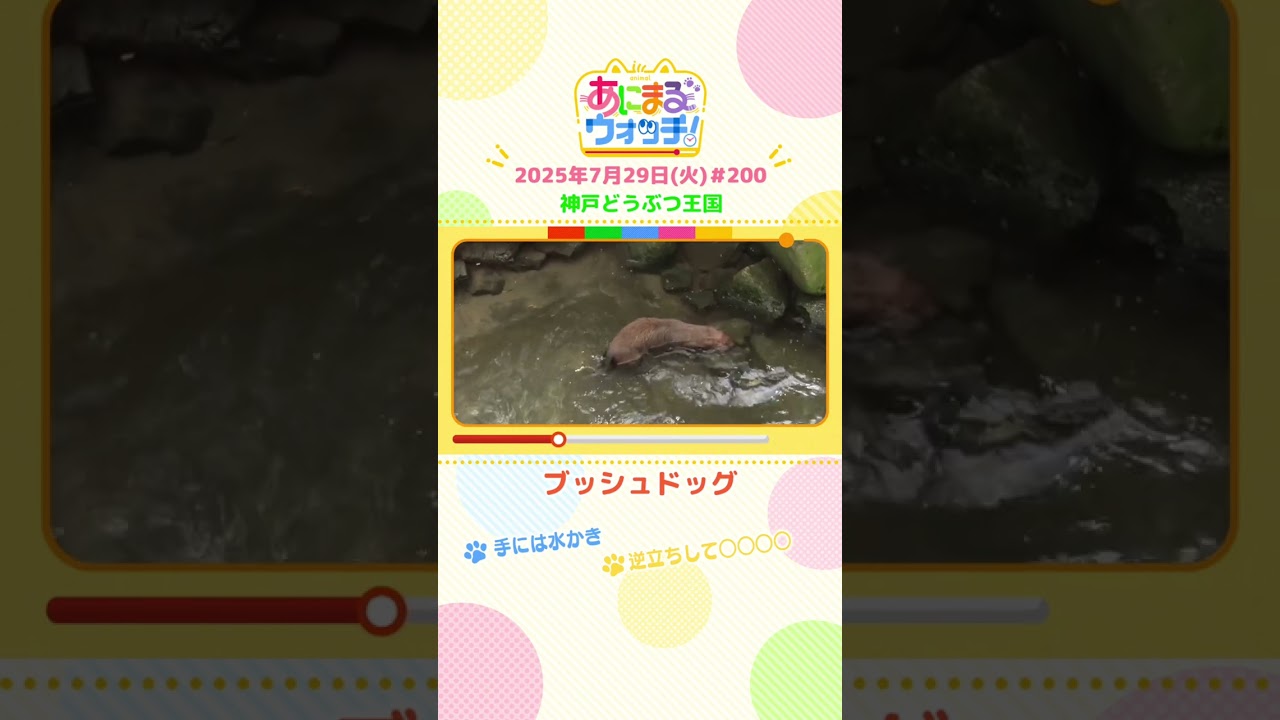 関西で暮らす動物たちのスを見つめる アニマルウォッチ。 今週は神戸市にある神戸動物王国からお 届け。 ウォッチしたのは犬のような熊のような 不思議な見た目をした動物ブッシュドッグ 。 名前にドッグがついている通り犬の仲間な んだけど、何でも犬にはできないことが たくさんあるんだって。 例えばこの手。よく見ると水かきが付いて いて水中に潜って上手に泳ぐことができる んだって。 あ、なんか今逆立ちをしたね。どうしたの かな? 女の子の物毒は逆立ちをしながらおしっこ をするんです。少しでも高い位置に自分の おしっこ匂いをつけることでここが自分の 場所だぞっていうのを周りのね同じ ブッシュドッグたちに知らせているものに なります。ちなみにオは逆立ちして おしっこしないそう なんだかメスの方がワイルドだね。 [音楽]