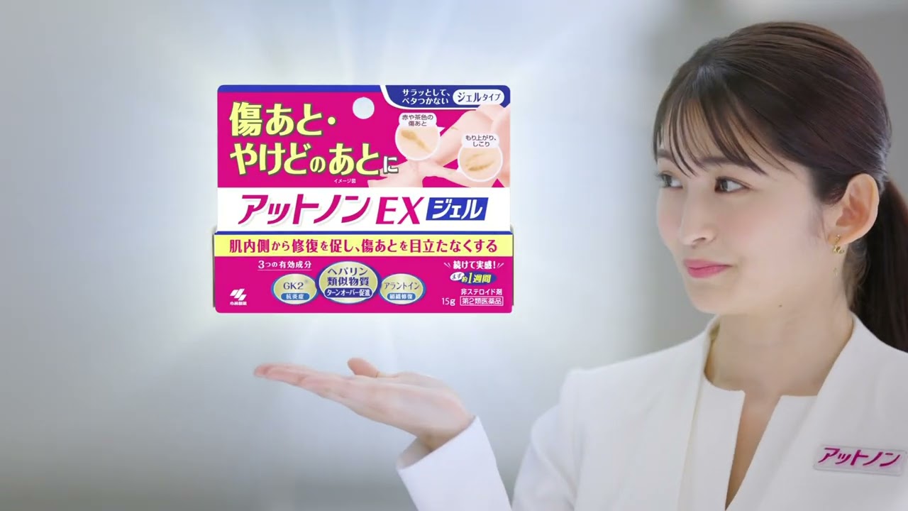 治りが遅い傷跡放っておくと残るかも。 [音楽] え、だったらアットの傷ついた肌組織を内側から修復して傷跡を目立たなくする。 [音楽] 続けてみて。アトのン