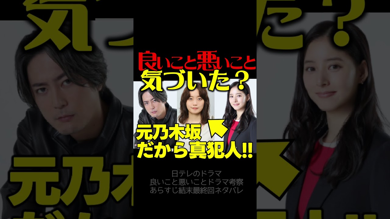 日本テレビの考察ドラマはこれまでにも見 られていますか?他にもあるとは思います が、その中でも特に最近の作品で有名なの はあなたの番です。新犯人フラグ恋は闇 あたりでしょうか?実は先ほどあげた3つ のニっテレさんが言う考察ドラマには他に も共通点があります。それは乃木坂46 ここでコメントをご紹介します。江口 誠一郎さんです。日本テレビの考察系の ドラマでは最近ことごく乃木坂46のOG を犯人役で拝しているあなたの番です。で は西の七瀬さんをサイコパスな殺人者に新 犯人フラグではイコマリナさんにヒロイン の血を抜かせは闇では斎藤ア鳥さんに事故 とはいえ義の母を刺させています。今回も 深川舞衣さんに逮捕案件をさせているかも です。妄想ですが、そんな角度の考察。 ちなみに上記4名は乃木坂46内でも兵局 センターを経験しているという共通校も あります。ありがとうございます。僕は アイドルはそこまで詳しくないので、 乃木坂46さんもそんなに詳しくないん ですが、調べてみると確かに西野瀬さん、 いこまリ奈さん、斎藤ア鳥さん、深川舞 さんは皆さん乃木坂4室に在籍していた頃 センターを務められたことがある方ですね 。今は皆さん女優として活躍されていると 思います。ということはニッテレの考察 ドラマに乃木坂46の元メンバーで センター経験者が出演したら逮捕される 事件を起こしての法則が成り立ちとなると 深川衣さん演じるしのが新犯人黒幕かもし そうでなかったとしても事件に関与はして いて何かしらを犯してしまっている可能性 はありそうすよね。