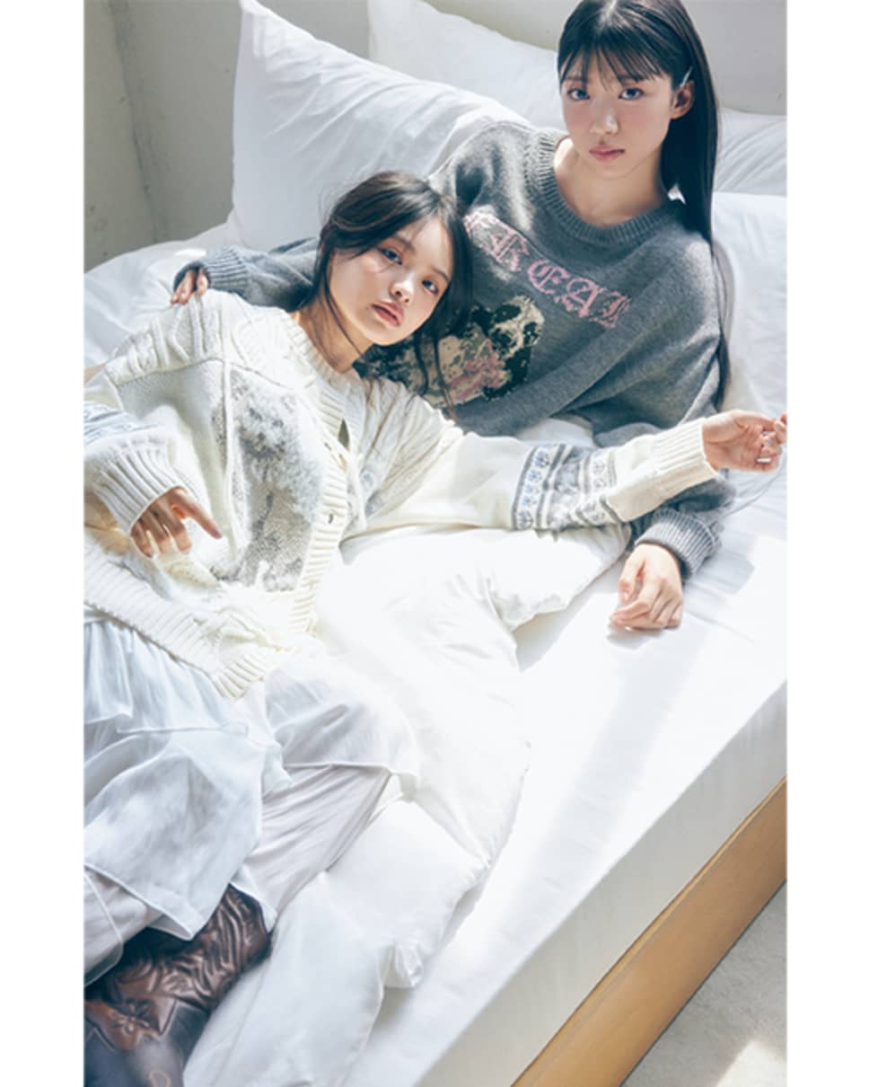 【左・浅井恋乃未】ねこカーディガン¥20350/Candy Stripper 中に着たキャミ¥2199/PHILLY フリルティアードスカート¥9900/アダストリアカスタマーサービス(ヘザー) ドットスカーフ¥550/WEGO ウエスタンブーツ¥18480/TINA:JOJUN 【右・佐藤愛桜】DOGニット¥7920/jóuetie ルミネエスト新宿店 ショートパンツ¥5700/HANA KOREA(BITTER CELLS) ビジューヘアピン(4本セット)¥660/パリスキッズ原宿店 ウエスタンブーツ¥11880/R&E ソックス/スタイリスト私物 ●商品情報はViVi2025年11月号のものです。