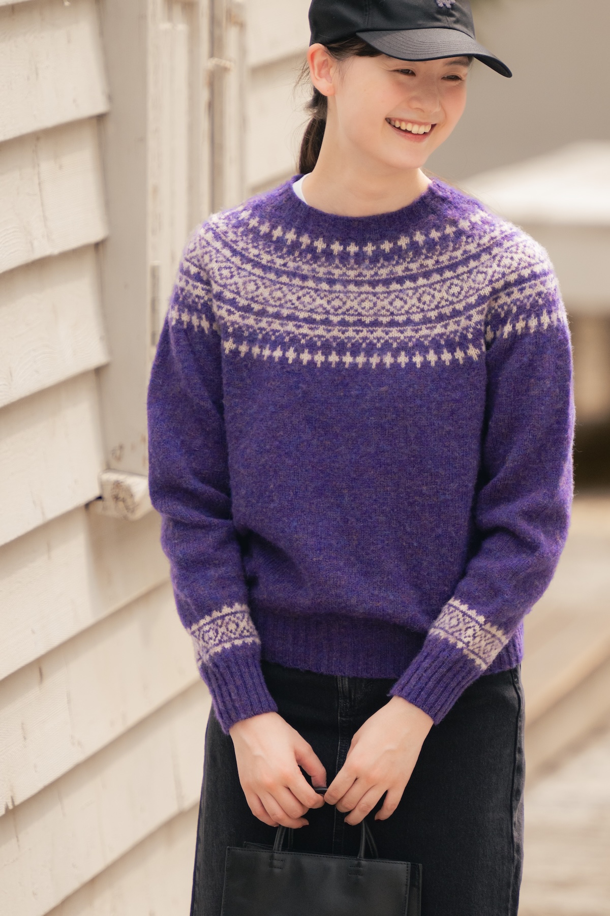 本日は、スコットランドの小さな島、フェアアイル島で生まれた伝統的な1枚「フェアアイルセーター」をFUDGE FRIEND のうさみ(身長169cm)が着こなします。