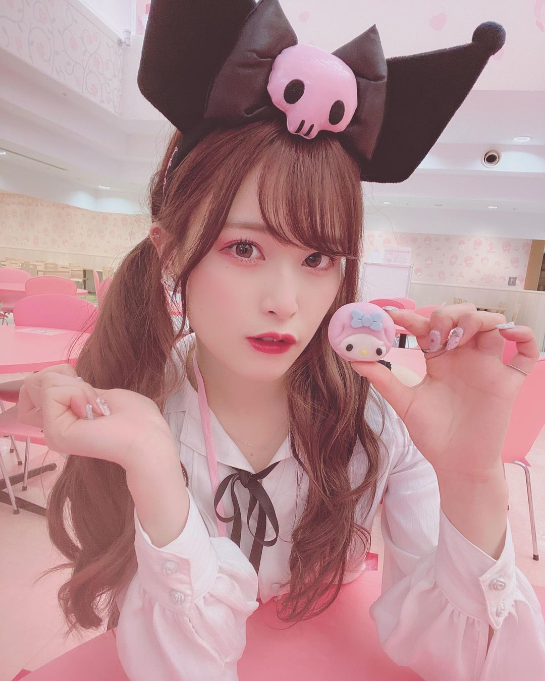 いかにもな格好してピューロ行ってきました❣️クロミちゃんです🖤🐰マイメロ食べさせてもろて❕ #ピューロランド #クロミちゃん#地雷女 のこすぷれ #kayoko_takita#田北香世子akb48Kayoko TakitaTakita Kayokoクロミちゃんピューロランド地雷女