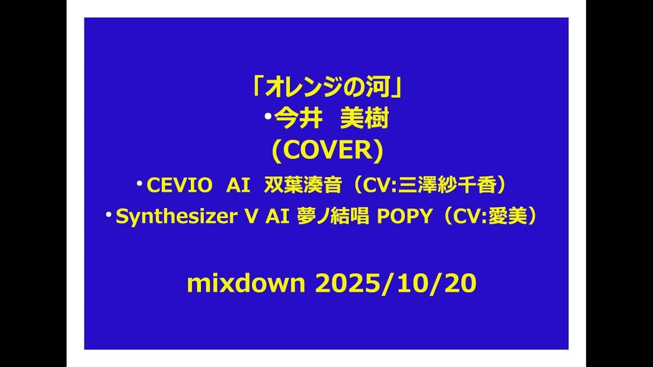 「オレンジの河」 今井 美樹(COVER) CEVIO AI 双葉湊音(CV:三澤紗千香)Synthesizer V AI 夢ノ結唱 POPY(CV:愛美) test_music_mixdown 2025/10/20 female voice actorsvoice actorsvoice actresses三澤紗千香声優美人声優 Write A Commentコメントを投稿するにはログインしてください。