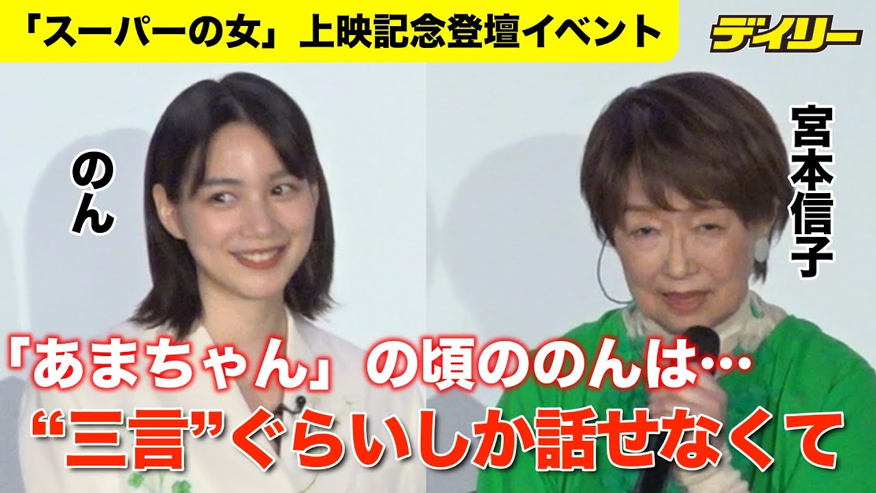 え、今日は本当に皆様にお会いできるのを楽しみにしておりました。本当にいらしていただいてありがとうございます。 [拍手] ありがとうございます。ノンさんからも一言ご挨拶をお願いいたします。 え、皆さんこんばんは。のんです。え、今日はこのような素敵な場所に呼んでいただけて本当に嬉しいです。よろしくお願いします。 [拍手] あの、実はこの企画を進めるにあたって のんさんに痛み映画で好きな映画は、ま、 全部好きだという風におっしゃってたん ですけど、特に好きな映画は何ですか?と いう風に伺ったところ、タンぽとまサの女 と、え、それから民の女と、そして スーパーの女と4作品をお答えいただき まして、ま、中でもスーパーの女は花子と 五郎の津さんと宮本さんの家計がとても 良かったっていう風におっしゃってました けど、スーパーの女改めて見 いかがだったでしょうか? やっぱりめちゃくちゃ面白いと思って、あの、改めて見ても本当に興奮しましたね。 あの、花子と五ロのあの、掛け合いが本当 に楽しくて、あの、宮本さん演じる花子が こううちうちし てる頃の空気をパーン 改を切り裂くのがあの気持ち よく見て楽しいって思いました 。宮さんはい。 宮本さん、あの、本当に津さんとね、ご意されて、南作品ごされてる中で、このスーパーの、あの、ごされる時間も長かったと思うんですけれども、撮影での思い出とあれば是非お伺いしたいですか? あ、本当に津川さんとはもう、ま、このお葬式の前から何度もあの、ご意させていただいて、それでも 1 番あの2 人であの芝居していいなと思ってのは揚げ満の時でした。 本当に2人の1番いい時の状態を監督に 取っていただいて2人で良かったなんてね 自算しておりましたけどでもまた重きを 変えてこのスーパーの女ではあの学校の小 学校の同級生ですから本当に楽しくてね菅 さんはあのなんかボケツッコみみたいな 感じの漫才みたいなことが多くてすごい私 がテンポへこパパパパって言うとああそう みたいなん それで 長いあの、ま、シなんですけど、それも ワンカット。 あの、つまり俳優、伊痛監督は俳優身だから、あの、俳優と俳優同士の間の芝居がすごく面白いって言ってるらして、 それからだんだん私と津さんとのスーパーの女ではほとんどワンシーンワンカットの日がずっと続いておりました。 だからそれを見て監督モニターをこう見てなんかこうあなぐで撫でながらニヤニヤニヤニヤしてたのを私は覚えております。 そうですか。はい。 あの初めに伊監督から今度のテーマはスーパーの女なんだっていう。ま、スーパーを舞台にしたドラマなんだという風に伺った時は本さんどんな感じだったんですか? 私ですか?私はほらやっぱ尿房なので その辺はよく知ってるんですね。 あの、知ってるんですけど、あの、本が出来上がるまで分からないんですけど、本当にサミットっていう会社のあのに協力していただいて、そこでずっとだってセット組めないですもんね。スーパーのマーケットの。 はい。 で、そこでずっと撮影したんですけど、 本当に こう身近な花子と私たちのこうおばさんが ね、すごくだんだんこうあのスーパーの こうあ、なんて言うのかな てだんだんグレードアップしていて彼女が 思うようなきあのスーパーにしていくのが すごく痛した。うん。 まずのさん、伊痛み映画で演じてみたいは何ですか?という質問が 1 番多かったんですけれども、いかがでしょう? あ、すごい緊張する質問ですね。なんかすごくあの宮本さんを前にしておましいんですけど、あのスーパーの女の花子はめちゃくちゃやってみたいって思いました。 の、あの、宮山さん、それを伺ってどうですか? あの、ま、10 作品ありますけど、その中そうですね、のんちゃんが本当に今のこの年齢で、あの、この感じできる、そしてやりたいっていうのはスーパーの女だってことがすっごくよくわかりますね。た、 あ、楽しい。楽しい。楽しい。 あ、なんかそのせっかくだから目本さんのかっこいい役もやってみたいなと思ったんですけど 相手役がね、どの人になるかとかそういうこと。それも想像するとね、あのタれも楽しいわね。 楽しいですね。 ねえ、本当。うん。宮川さんどうぞ。 ありがとうございます。ごめんなさい。 ちょっと今、え、ちょっと違う質問がもう 1問、え、初めてのに会った時から今こう やってまたね、え、色々と舞台やお芝居と も宮山さんご一緒されてますけど、1番作 が変わった 部分そこはどこかというのを宮山さん に伺いたらと思うんですが、最初は本当に まだ10代28歳そうですね19歳とか9 歳だったかしらね。のあまちゃんの時は その時は本当にあの見こぐらいしか言え なく てありがとうございます。はい。頑張り ますぐらいしか言えなかった。本当にそう いう社員な子がだんだんいろんなことを 苦労してそして成長してそしてこの年齢に なって本当にあの自分の意見をしっかりと 言える素晴らしい