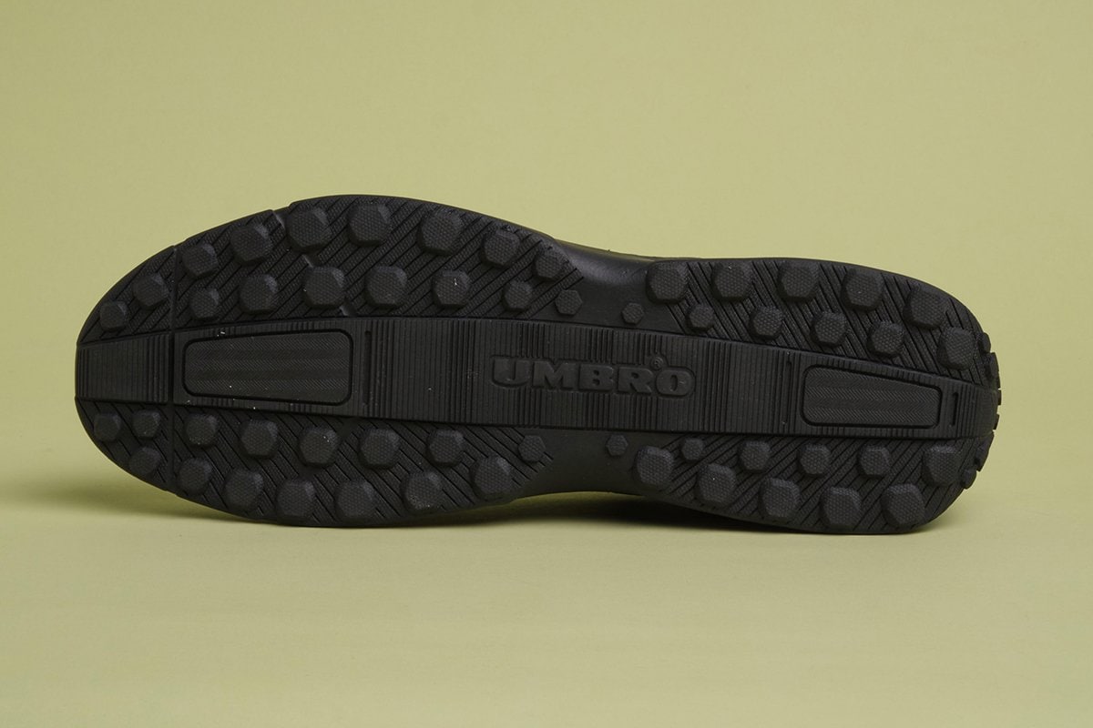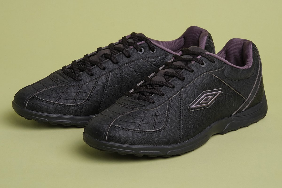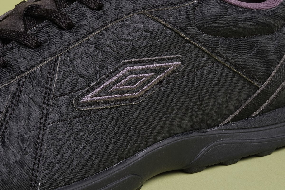 英国発のフットボールブランド「アンブロ」とのコラボレーションとあって、こちらはフットボールシューズがベースに。一見するとシャープな印象の真っ黒スニーカーですが、アッパーは凹凸をあしらったシンセティックレザーを採用。奥行きをもたらすとともにヴィンテージ感漂うルックスは、いわゆる真っ黒スニーカーとは一線を隠す独特なアクセントを与えてくれます。