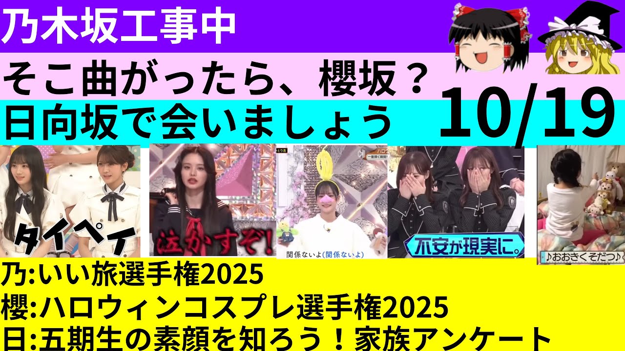 こんにちは、ウース。今日は10月19日 の深夜に放送された3番組の話をしていく よ。このチャンネルでは乃木坂46、桜坂 46、日向坂46のことを話と思うので よかったらチャンネル登録していってね。 最初は乃木坂工事中ね。いい旅戦選手権 2025ね。井上ナは福井に行ったそう です。福井駅では恐竜をお出迎え。 なんで私の頭の中に日向坂の小坂直が出てきたのか不思議。 小坂直も恐竜が好きだよね。そうなんだけど恐竜と聞いた時点で小坂おを思い出すほど私の中で両者が直結していたことに驚いた。 この福意西口の恐竜広場は期間限定イベントじゃなくてずっと恐竜がいるみたいです。 今回の企画で1 番ピンと来た。行きたくなった。さすが井上ナ。 他のメンバーたちは規制化海外。 もう1 つは川パーク。働くおっさんでも行ける旅先としては福井駅だけだろうね。 [音楽] 次の家族旅行で母ちゃんを連れて行こうかと思ったけど泊まりたいってリクエストしたホテルが岩手にあるんだよな。福井まで遠回りできないか。 [音楽] 薬見書きはるかの以下はパークデートがあり デート日直前に約束の確認していいか 2人とも考え込んでたとか可愛い 川崎さ遠く大派は大平に行きました。 紙できたランタンを飛ばすお祭りは綺麗だったんだけど、私が面白かったのはプリクラさんの話。日本のプリクラの常識レベルまで上がっていないのが大平のプリクラ業界なのか、奥田色ハたちが入ったプリクラさんだけなのか分からないけど手作り感がいい。 撮影するカメラ丸出だしなところとかね。 壁を作っている板をレンズ台にくり抜くんじゃなくて手が届かないような上空にカメラが配置してあるところとか大好き。 それとドラム式選択機っぽいところに上半身を突っ込んで撮影する工夫とかいい。 撮影空間が狭いプリクラを作って周りもレフ効果があるような壁を設けた。洗濯機っぽいデザインは遊び心だね。 多分このプリクラ矢屋のオリジナルじゃなくて市販で売ってたものなんだと思う。日本のプリクラのような技術はないけどアイディア工夫でカバーしているのが好きでね。ちょっと思っちゃったのだけどさっておしりが得意ではない。 [音楽] いや、友達とおしりするのは好きなんだろうけど、メディアに乗る喋りをすると緊張するっていうか。 どうした?突然。 今回喋ってたのが奥田色派だったんだよね。それはそれで奥田色派が可愛かったからいいんだけどさ。前回のヒット祈願で一瀬ミクと自転車でお変露した時に一瀬ミがずっと喋ってて川崎さが聞いてたんだよね。それは一瀬ミのマシンガンおしりが止まらないだけかと思ってたんだけどその一方で川崎さも聞き役に徹してたなと。 [音楽] [音楽] 川崎さがエピソードトークをしている イメージはあまりないかな。神宮の アンコール前に一瀬ミクと2人で出てきた 川崎さは会場を1つにしてたからおしり できないわけじゃないんだけどね。 神奈川と里香川は韓国へパンを食べたそう です。ちょっとググったら韓国のパン人気 なんだね。パンでしょ?国を超えて食べに 行くほどのものか。町のパン屋さんが韓国 に行ってパンを食べれば再現して売り出し そうだけどな。 塩パンにはまっているらしい。パンって強烈に大好きなメンバーってたまに出てくるよね。 塩パンと言われて色々思い出した。久保しおりがすごく美味しいパンがあるパン屋さんがあるけど強烈になるのを恐れて教えてくれないとか。 [音楽] 星の南がパンが好きでミぐりでも好きなものはと聞かれてパンと答えるがあったとか日向坂では渡辺美ほと佐々木未れがどちらがよりパン好きか争ってたとか [音楽] 2 人とも将来はパン屋さんになるとか言ってたような覚えがあるけどどうなってるんだろうね。 その佐々木未れは食パンは味がしないからパンじゃないと言ってみたりとか。 [音楽] その後食パンもパンと認めたそうです という記憶がさっと出てきた。 パンってフックだけでたくさん出てくるな。 桜坂は渡辺リカがパン好きで 3 期生にもパンにはまったメンバーが気がする。 6期生は規制したみたいです。 親元を離れて生活しているんだから長い休みができたなら帰るのが最優先だよね。 うプ主もすぐに帰るしね。て新規ちゃんとおっさんの規制は別のものか。長嶋はみんなで回転寿司に行ったそうです。 [音楽] これ見たことあると思ったら乃木坂配信中で岩本連下と菅原さが言ったところだった。 本当だ。 いくらのやつやってる?それと奥に立っている店員さんは今回も奥に立っていた店員さんだ。 [音楽] キャプチャ取ってて気づいたんだけど 2人が行ったのが2年前1144 円長嶋マリオが1500 円ぐらいって言ってた。2年で2 割りまし物価上がりすぎだよね。 この回転寿司屋さんのチラシを見つけました。 2024年11 月版で税みたいです。今はさらに上がってるんだろうな。 [音楽] 長嶋マリオは来年は家族にご馳走するって言ってる。 親御さんは泣くほど嬉しいだろうね。というか泣くだろうね。そしてそ
