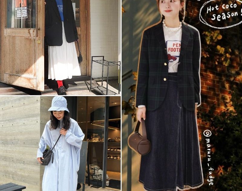 「カッチリ見えがちなチェックジャケットは、ロゴT+デニムスカートでカジュアルダウン!秋のおでかけにぴったりな、プレッピーMIXコーデの完成です。綺麗めなローファー、カジュアルなキャップと、小物もバランス感が大切!」。