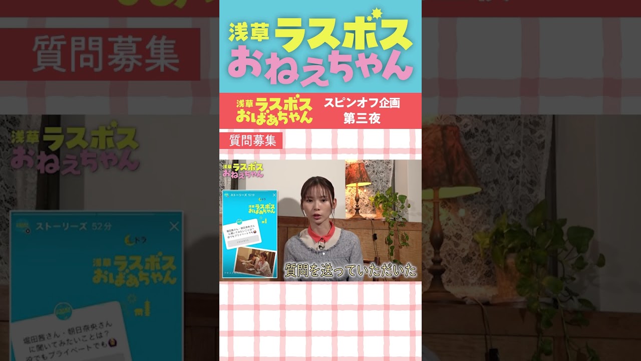 #浅草ラスボスおばあちゃん #堀田茜 #朝日奈央 スピンオフコンテンツ「浅草ラスボスおねえちゃん」#3ちょい見せ① 東海テレビ公式YouTubeチャンネルで配信中! 今回はですね、視聴者の皆様から私たちにインスタで質問を送っていただいたということでありがとうございます。 ありがとうございます。ござ お あ、ありがとうございます。 これだ。 これだ。 あ actressラスボス堀田茜女優朝日奈央梅沢富美男浅丘ルリ子研ナオコ Write A Commentコメントを投稿するにはログインしてください。