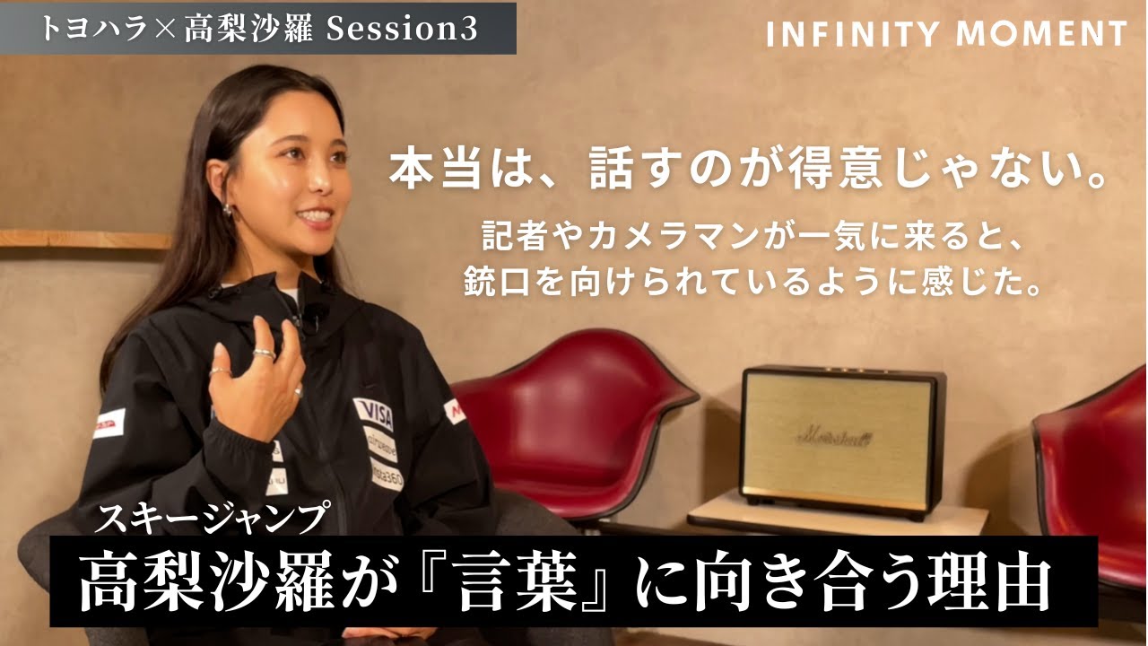 スキージャンプ高さ選手。近年では競技 以外の分野での発信も注目されるように なっている。 その裏には10代半ばで世界のトップに 立ったからこその苦悩があった。 来られるのは苦手なタイプだったので記者の方々やカメラマンさんがわっと来ると重厚向けられてるみたいな感覚になるの。 [音楽] ま、でもそれだけじゃダめだな。 [音楽] スキージャンプの第1 戦を常に歩み続けてきたことで手にした変化とは? この20 年で人が変わるぐらいの勢いで変わったんじゃないかな。 [音楽] こういう風に歩んでいきたいビジョンみたいなものってのは今お持ちなんですか?インフィニティモーメントセッション [音楽] 3では高橋選手の今と未来に迫ります。 [音楽] ご自身のそういう人としてのなんか変化みたいなのっていうのはどんな風にこう振り返ってこう捉えられますか? そうですね。でも私が多分出始めて調子が良かった時ってあんまり会話とかコミュニケーション取れなかったと思います。 [音楽] なんかそれくらいインタビューとかこうやってお話するのも苦手な方ではあって人と話したりとか うん。 それは私たちも感じてました。 はい。なんか、ま、その試合で勝った時は結構な記者の方々やカメラマンさんが、ま、写真を撮るんですけど、それが一気にわっとくるとちょっと慣れてないので怖くて ああ、最初は はい。 取られるのは苦手なタイプだったので、なんかこう重厚向けられてるみたいな感覚になるんですよね。 ああ、 すいません。なんか抜けて抜けてる立場だったんです。すいませ。 ありがとうございます。はい。 そうか。でも中学生ぐらいでそんなもうカメラの そうですね。なるべくカメラを避けながら移動したりとかウォーミングアップ行ったりとかしてました。 ま、でもそれだけじゃダメだなっていうの はやっぱりスキージャンプって先輩たちの 世代の方がみんなまとめて引っ張ってきて くれてようやくワールドカップとか オリンピックができてでそこでたまたま やっぱりその中でスキージャンプっていう 競技をやらさせてもらっていて調子がいい 時に成績がかなり重ねられたとは思うん ですけどじゃあ先輩たちがいない今自分が できることって何だろうってなった時に スキージャンプをもっと多くの方に知って いただくっていうことが自分のやるべき ことだとも思いますしてなった中で喋れ ないじゃ 知っていただけないなって思って でインタビューとかもう回数を重ねて喋る 中で自分の思ってることを伝えられるよう になってきたかなとは思っているんです けど この20 で人が変わるぐらいの勢いで変わったんじゃないかなって自分でも思っています。あ、 はい。 多分ザ王の初めて買った時の私の様子からこうはならないと思うんですけど 大変失礼ながらはい。 あの、たくさんお話だけるようになったなという実でも自覚をしてそうやって取り組み始めたのって何歳ぐらいの時だったんですか? [音楽] えっと、4 ちゃんに向かってる年なので、ま、そ置の後とかですかね。 はい。あ、なるほど。じゃあ151617 ぐらいの ま、でも20 時ぐらいからですかね。はい。 あの、そういう意味で、あの、これもちょっと想像するになんかやっぱり求められるものとか、 [音楽] あの、なんとなくこうメディアが、ま、私たちもその一なんですけど、メディアがこういう高橋選手像を作ろうとしているとか はい。 なんかちょっと演じない、演じないといけないみたいな感覚とかっていうのは若いながらにやっぱちょっとあったりはしたんですか、当時。 うーん。ま、でも若い頃はそうですね。 若い頃っていうか多分20歳になる前とか その付近ってやっぱり 競技に集中したいけど、ある程度のそう いうお仕事とかもあったりもするのでどう していいかわからないっていうのが1番 最初に来るんですけどでもなんかその道の プロの人たちに身を任せてれば大丈夫か なって思いながらはい。やまじゃそんなに 無理はされてなかったうん。 あんまり無理だとは思ってなかったですけど、あ、こうした方がいいんだとか、こういう風にこういう言葉遣いとかこういうタッチ振る前をした方がいいんだっていうのは学ばせていただきました。 それはやっぱりあれですか、こう自分がそのジャンプの魅力を発信していかなきゃいけないっていうある主任感みたいなものからそうなっているんですか? そうですね。 やっぱり、ま、その競技っていうところからだけじゃなくて、やっぱり人間として興味を持ってもらって、そこからスキージャンプに 興味を持ってもらえるっていうケースもあるとは思うので、そちらの方でもこうスキージャンプ競技っていうのを知ってもらいたいっていうところからこんな感じですか?うん。なるほどね。 [音楽] はい。 あの、ま、改めてそうしますと、ちょっと今後っていうところについて伺っていきたいんですけども、 アスリートとしてっていう部分もそうですし、 はい。 その高さらさ