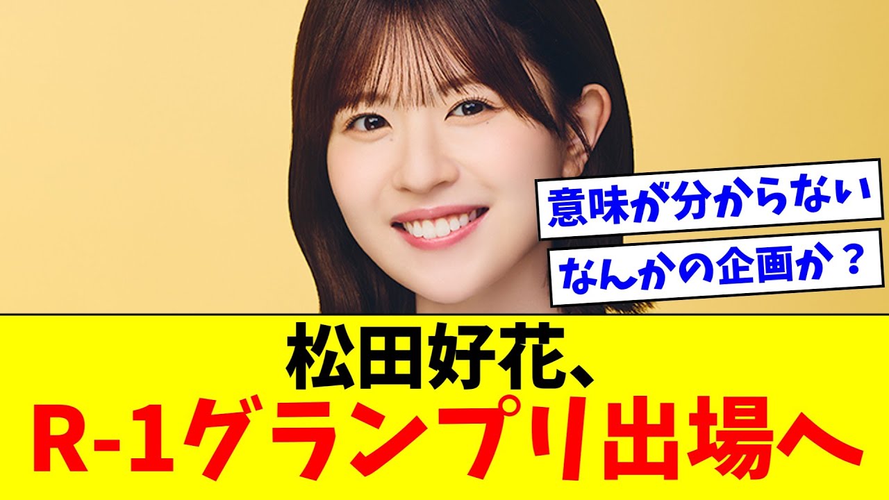 [音楽] 松田R1グランプリ出場へ。 R1はこれがちなやつ。13日の大阪1 回戦出場者に松田子のか松だり井上りナの名前ある。根本藤だ。 よ見つけてくるな。種花って書いてある。 意味わかんなくて草。 これはそれぞれPンで出場ってことかな? R1だからP での出演でどこまで行けるかみたいな企画でしょうよ。なんかの番組の企画かな?インストール企画みたいに芸人が書いたネタをアイドルにやって回って通過するかみたいな。花単体だったら何やらせてんだ?この野郎と思ってしまうから企画で会ってほしい。 [音楽] 予選からネット配信するって書いてあるから企画は不明でもネタはすぐわかるな。 坂道メンバーは収録のワンコーナーくらいでしょう。公式アンバサダーとかただ文面を素直に読むとそれぞれがネタを披露する展開。今年最大の謎脂と入場量が安すぎるし。 [音楽] R1 側のプロモーションの一環だろ。話が来たけど出るってマネージャーから振られて出場することになったのがその 3人ってことで。 R1 とか決勝でも変な空気になるのによく出るわ。 オタクたちが見に行くのはもう仕方ないとしても R1の1 回戦の空気に耐えられるのかな。他の勝レースに比べても 1回戦の空気が桁違いでやばいって聞く。 予選突破して泣き出す松田子も見てみたい気がする。 [音楽]