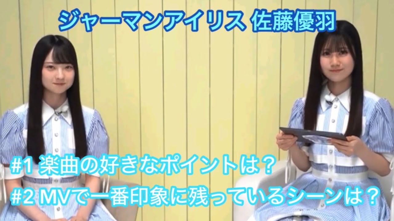 [音楽] それでは佐藤ゆに質問です。 はい。 じゃあジャーマーアイリスについて歌詞の好きなポイントを教えてください。 はい。私が好きな歌詞は 2番のA メロの人は皆の間に大人になってしまうんだろう。 知らないこと、その全てを知ることがいいことかいというところで最後に問いかけるようなところもあって自分に問いかけているのかあるいは人に問いかけているのか というところでもすごい意味が変わってくるなと思っていて うん すごい印象深い歌詞です。 その前の部分と結構一ぺして疑問を投げかけるっていうのもすごい新しくてね 刺さるしね。うん。ガラっと雰囲気も変わってすごい好きなとこです。 [音楽] では佐藤に質問です。 はい。 ミュージックビデオで1 番印象に残ってるシーンはどこですか? はい。 私は個人個人のリップシーンっていう 1 人で歌っているシーンがすごい印象に残っていて、最初は松尾さが王の学のところから始まって色々みんなが [音楽] うん。うん。1 人で歌っていくっていうところなんですけど、やっぱりその 個人にフォーカスが当たることによってすごい感情表現だったりっていうのが繊細に見えてすごい 好きです。 うん。 みんなそれぞれの良さがね、出てて、あの映像に 何回見ても楽しめるミュージックビデオだなって思います。すごい素敵だよね。うん。素敵です。 [音楽] お [音楽]