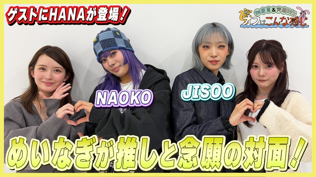 ナさとメイでおしべり。 今日はどんな話するの?ルんルんルんルんルんルんルんルんトメイ斎藤ナさん [音楽] オフはこんな感じ イエーイ ちょっとなんか今日は はいはい 落ち着き女子みたいな感じで女なんですけど大事件なんですね。 はい。これもう本当にどうしますか? 今回スペシャル スペシャルなゲストスペシャルすぎる。うん。 ちょっと 具合悪いですね。うく喋れない。あんなにベラベラで喋ってる私たちがうまく喋れなくなる。もうおし目の前にすいません。スペシャルなゲストにお越しいただいてます。なんと 花のじさんと直さんです。よろしくお願いします。 よろしくお願いします。 花のな子です。 花のちです。よろしくお願いします。 ありがとうございます。 どうしよう。いやいやいや。 ダメだろね。ほんまに ダだろ。普通にな んでやねんこれ。ごめんなさい。本当に声 が出ない。前回の配信で私とナちゃんが花さんの大ファンで 2 人ともファンクラブに入っているって言ったのを聞いて番組のプロデューサーさんが事務所の方にゲストのオファーをしたところですね。開拓だきしかも奇跡的にスケジュールが空いていって今回出演が叶いました。 本当に。あ、どうしよう。 もう、もうなんかさっきから挙動がおかしいさの。あ、どうしよう。い、 どうしよう。可愛い。 いや、どうします? いや、まず本当に嬉しい。 お塩を目の前にして今どうですか? いや、どうしますか?あの、見れない。 いや、私、あの、ちょっと今回のお会いするって聞いて、画を見返したんですね。え、 だから昨日とかもう泣きしてて夜分かるわかるよ。 だからなんか 本物なるよね。 MVを一気見してきました ね。私もずっと今日朝流してた。 ありがとう。 ありがとうございます。え、 めっちゃ嬉しい。 すいません。あの、簡単にこう各々の自己紹介みたいなのだけたりしますか? あ、私はあの青が 1番好きで 最近ずっと青髪をやってるんですけど。 やってる。可愛い。 青が好きでスイツが好きで音楽が好きでアニメが好きな実です。 あら、 じゃ、その青髪はご自身の好みでやってらっしゃるんですか? でも元々はあのブルージンズの時青じゃなくて私は実際ピンクはやりたかったんですよ。そしたらちゃんみなさんがこういう青はどうて提案してくださって、 あ、じゃあちゃんみなさんのアドバイスなら絶対やります。そこから青髪になってました。 めっちゃ似合ちゃ似合ってます。そんなに 初めてでした。そういう明るい青髪は うん。そうですよね。確かにみ、もうすっごい綺麗な顔。 はい。見ちゃう。はい。 可愛い。 可いいです。ま、だいぶ変わってるんですけど新しい感じの青に染め直してたので結構シルバーで今てます。 確かさんは鼻の中で唯一韓国石でいらっしゃるですよね。 はい。し 日本語はこんな感じ。 すごい字もすごい上手だし。 字も見てる。 ごめんなさい。ごめんなさい。み がい嬉しいもじっくりではなこさん自己紹介お願いします。 はい。えっと、花の直です。えっと好きな色は逆に紫で。 あ、じゃ、紫だ。 じゃあそれもご自身の趣味というか好みで紫にし はい。 で、もうちゃめなさんがあの最初に紫どってやってくれて で、紫が好きでダンスが好きでシ音楽が好きで映画とかドラマも好きなんですけどめっちゃ見てて。 え、 本当に2人でさっきやばいちゃんに会る。 どうしよう。あかんよ、これ。 映画をめっちゃ見てたので今日は本当にありがとうございます。そんないいの知ってくださってるなんてことある?そ、 でも本当に私たちが出るってみんなあのメンバーのみんなが聞いた時にますごく羨ましいって言ってて ね本当に大好きって伝えてくれって言ってました。 ご飯3 倍行ける。今日これはだけでありがとうございます。 ありがとうございます。 いや、まずね、私たち本当にガチで うん。ま、花さんの ことが好きなんですよ。ただただ本当にただのオタクすぎてす。 なんかこんな押しを目の前にして何を喋ったらいいの? いや、本当ですよ。 ほら、黙っちゃ。 え、でも私これ言いたいじゃお願いします。 サマソにで4列目で見ました。 ええ、 そうなんです。 本当 はい。やってね。 あの、どうしても見たくて。 いやあ、ありがった。 4 列目で見ました。 熱の中で。 嬉しい。 2人とも同じも感しちゃと。 え、それ本当に私もう生のパフォーマンスを見て圧感されすぎて いや、やばいです。 鳥肌と涙が止まらなくなって もうそっからもう本当に毎日、ま、その前も見てたんですけど、もう改めてそっからまたもうわーって大沼になりました。い や、ありがとうござ、 ありがとうございます。 めっちゃ嬉しい。 めっちゃ嬉しい。4列目はすごいんです。 うん。の4 目すごいめちゃくじゃんじゃない。 めっちゃ準備してくださった。 ありがとうございます。 本当にありがとうござい 花のファンになったきっかけは でもそれこその川さん見させていただいてたんですけどなんかそこ