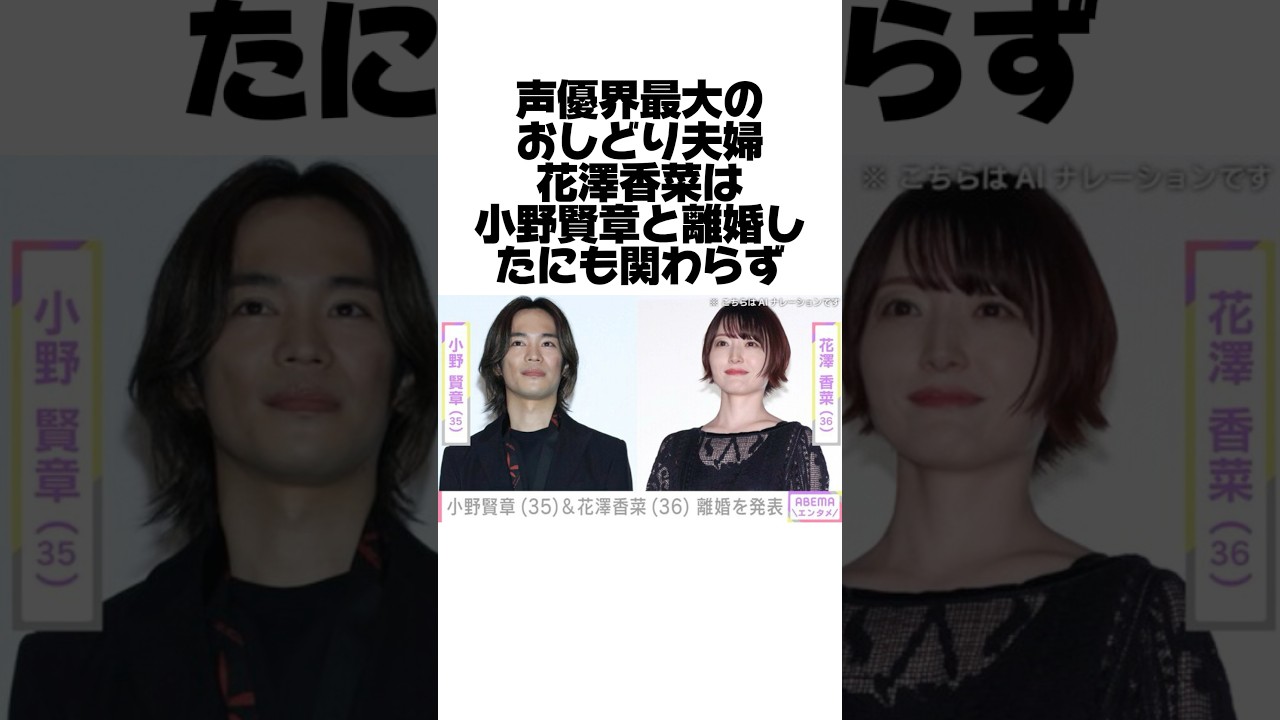 声優会最大のおし取り夫婦花はカナ野賢章 と離婚したにも関わらず、離婚発表後の 行動がメンタル化け物すぎて視聴者から大 歓起された。そんな2人は声優会で知ら ない人はいないほど活躍しており、花沢は 鬼滅後当文の花嫁はハリーポッターの ハリーヤクロコのバスケの黒コ役の声優を し、大人気カップルだったが生活リズムの すれ違いで時間を確保できず離婚に至り 悲しむファンは多かった。しかし離婚発表 してすぐに花沢はトランポリンで元気に ジャンプする写真をXに投稿し、さらに 番組の宣伝もしていた。またそのタイトル が1人でできるかだったために今後にそれ は草。メンタル強すぎと視聴者から たくさんのコメントが寄せられた2人の 新しい角で祝福