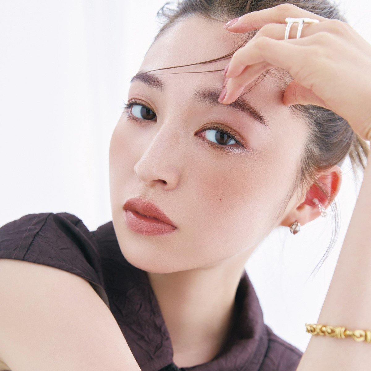 「偏光パールの光が今っぽいアクセントに。下まぶたの目尻にホワイトの光を差すことで、メリハリと抜け感もかないます。チークとリップもブラウン系で調和させ、より洗練されたムードに」(林さん)
