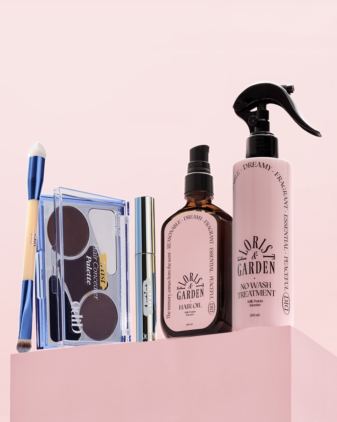 odiD(オーディッド)デュアルブラシ・ヘアカラーパレット・ヘアマスカラ・ヘアオイル・ヘアトリートメント(左から)