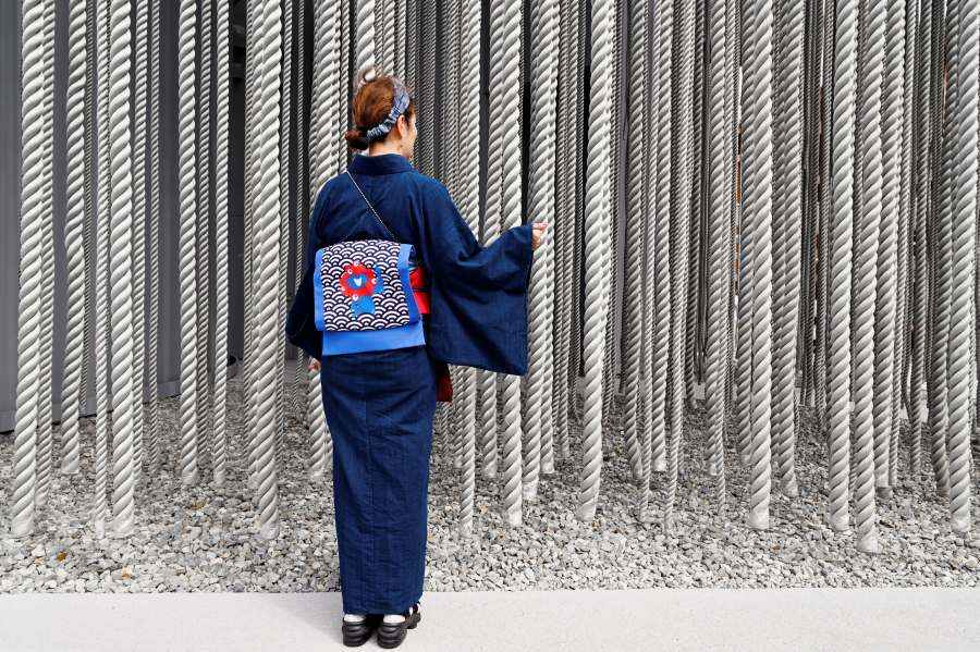 「ポルトガル・パビリオン」の近くでは、ステキな藍色の着物に日傘の女性を発見。普段から和装を楽しんでいるというこの方、市販のミャクミャクの手ぬぐいを活かし、帯にしたそう。ナイス・アイディア!よく見ると、半襟や、ネイルもしっかり、ミャクミャク柄。粋でセンスの良い上級者着物コーディネートだった。