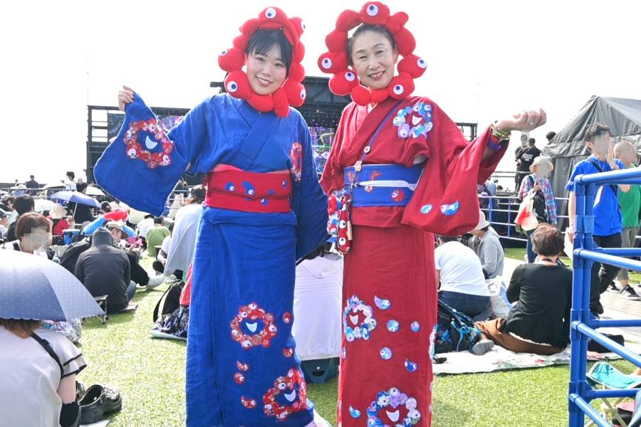 EXPOアリーナ「Matsuri」のイベント『ありがとうと旅立ちの祭典』で、和装で日本酒を楽しんでいるところをキャッチしたふたり。赤と青の着物には、それぞれ細部までこだわりを感じるオリジナルのミャクミャクや「こみゃく」をデザイン。万博愛にあふれた、かぶりもの×着物の「お目立ちコーディネート」で最終日を満喫していた。