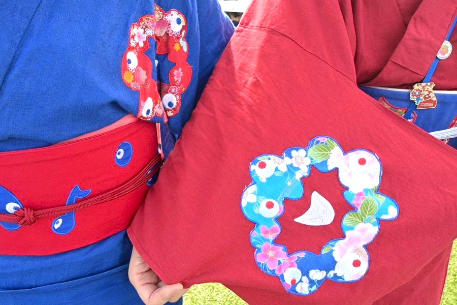 ミャクミャクが笑っている!「こみゃく」もいる!万博愛が詰まったオリジナル着物(10月13日/大阪・関西万博 Lmaga.jp編集部撮影)