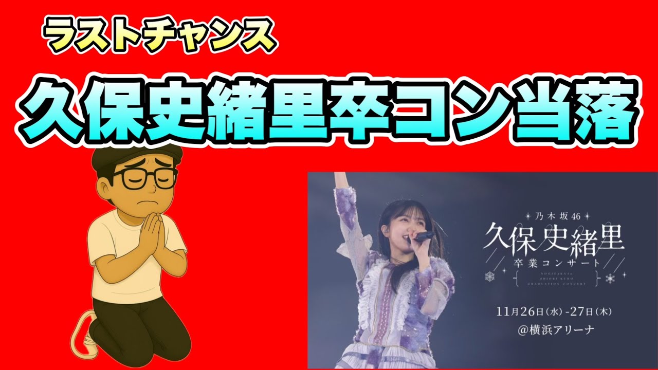 はい、大チャンネルです。ご視聴いただき ありがとうございます。え、今日はですね 、え、久保勝利卒業コンサート 到落発表ねしたいと思います。よろしくお 願いいたします。 いや、大チャンネルね、え、落ちまくっ てるんですね。 で、一般の抽選、え、 やってみました。ま、年も紐も確定したの で後からなったんでもう27しかねいけ ないんですけどということで ドゥルドゥルドゥルドゥルド 楽戦ということでね行けなくなりました。 うん。残念。え、25日はね、え、日向坂 の新山、30日はね、え、乃木坂の新山な んですが、その間に予定入らなかったです 。 いやあ、残念。ま、配信でね、え、2日間 見たいなと思っておりますので、え、また ね、そのレポ 出したいなと思っております。いや、 ちょっと残念でしたね。うーん。 残念。 そういえばね、え、久保さんで思い出し ましたけど、オールナ日本のね、え、 公認は井上さんでしたね。いや、ちょっと わかんなかったですね。ま、でもゲスト出 た時点ではね、ああ、そうなんだって感じ になりましたけどね。 さんもね、え、ま、あと2週間ぐらいです かね、え、の 乃木坂活動になりますんでね、え、そう いったところもありますし、ソロ局もね、 ありますので、その辺も期待したいなと 思っております。え、タイチャンネルでし た。ありがとうございました。この大 チャンネルは相坂道グループの出来事を 中心にお話しするチャンネルです。 チャンネル登録、高評価ボタンよろしくお 願いいたします。
