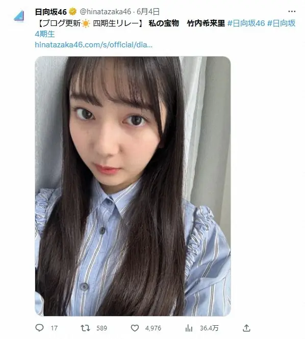 竹内希来里(日向坂46の公式ツイッター@hinatazaka46から)
