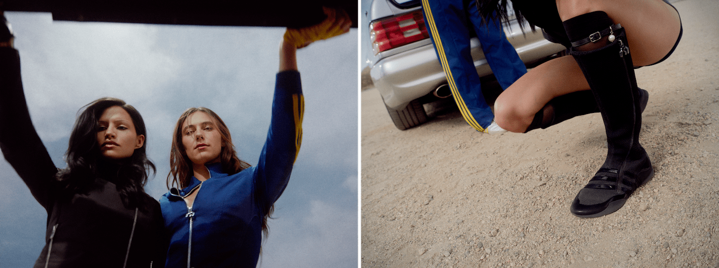 今回のコラボレーションでは、モータースポーツから着想を得たコレクションを展開。Miaouらしいフェミニンで構築的なシルエットに、adidas Originalsのスポーティーなエッセンスがミックスされた、フェミニン×スポーツスタイルを提案する。