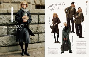 今回は「ネコのパレット」(P50〜)と連動して、三毛猫みたいなやさしい白と黒と茶、サバトラのようなクールな黒とグレー、茶トラのあったかい白と茶など、ネコをお手本に3色以内で洒落てる、冬の色合わせをお届け。ボリュームのあるコートの着こなしや、ニットやベストなど、これからの季節に参考になるコーディネートは必見です。