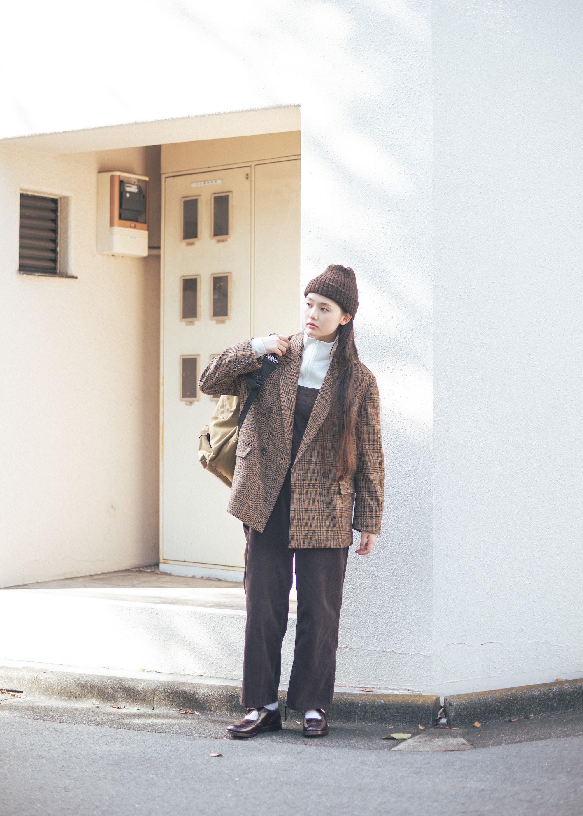 ジャケット¥22000、オーバオール¥8580 / ともにFREAK’S STORE(フリークス ストア渋谷)、トラックジャケット¥19800 / LeSportsac(レスポートサック)、ニット帽¥14300 / KIJIMA TAKAYUKI(キジマ タカユキ)、デイパック¥6380 / OUTDOOR PRODUCTS(アウトドアプロダクツ カスタマーセンター)、シューズ¥77000 / SANDERS(サンダースジャパン)、ソックス(6P)¥4180 / THE RAILROAD SOCK (メイデン・カンパニー)