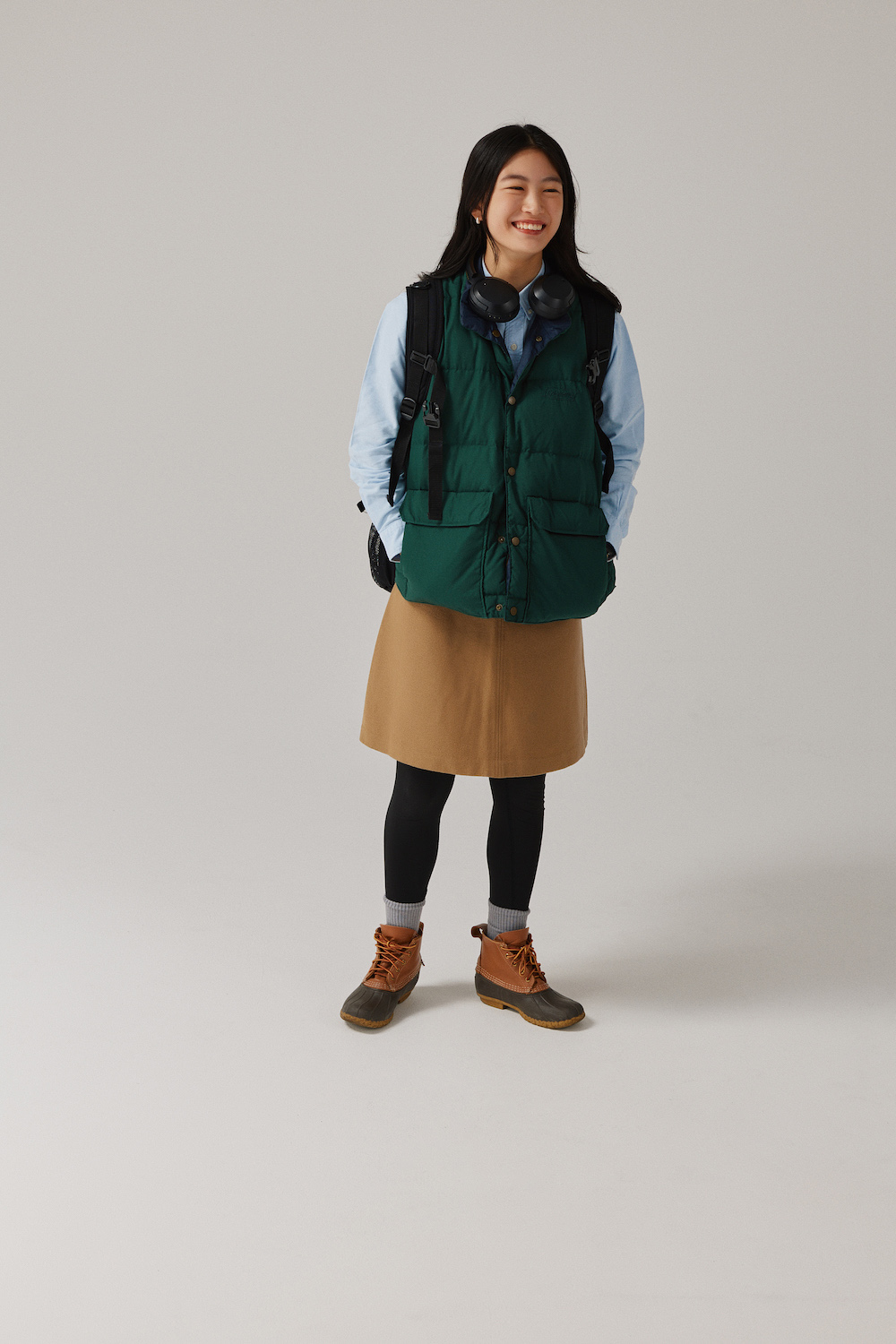 「秋冬のキャンパスルックはダウンベスト×スカートがやっぱりかわいい!履くだけでボーイッシュなムードを追加してくれるビーン・ブーツはリサイクルショップで出会ってから欠かせなくなった相棒的存在なんです」