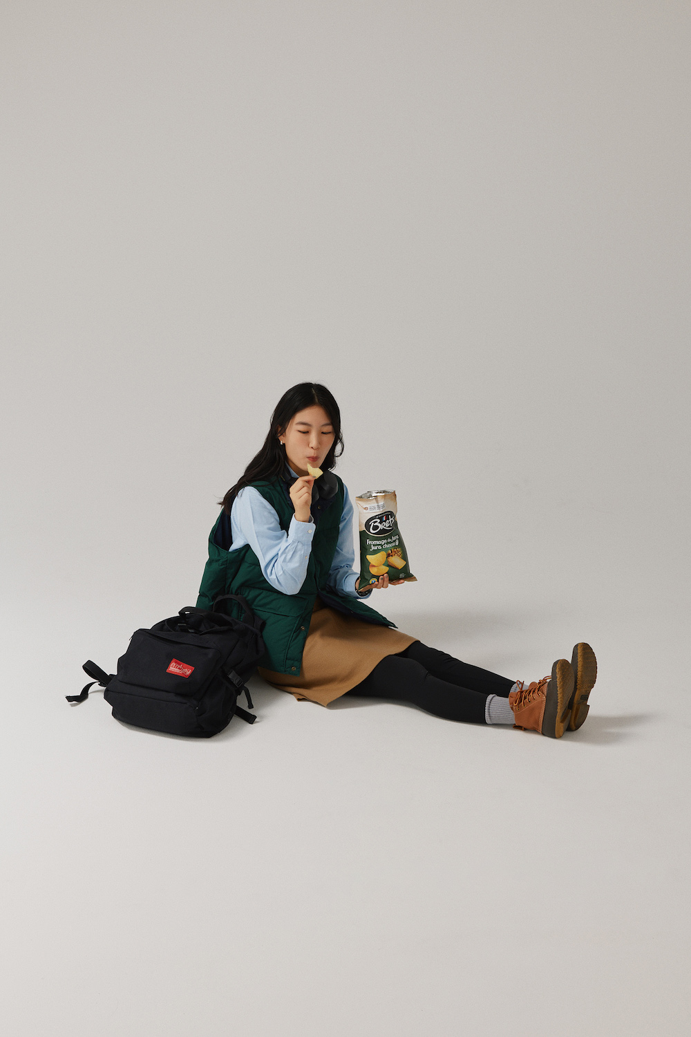 本人私物(ユーズドのシャツ/UNIVERSAL PRODUCTS.、ユーズドのスカート/LOURPHYLI、ダウンベスト/Columbia、タイツ/mont-bell、ソックス/GU、ユーズドのシューズ/L.L.Bean、リュック/Manhattan Portage)