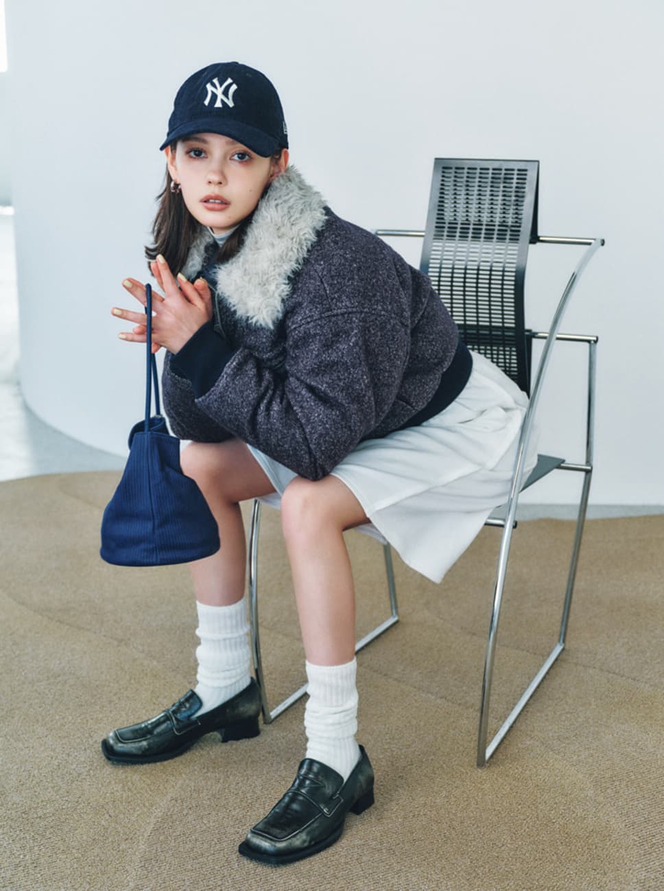 ブルゾン¥17600、ローファー¥13200(LAGUA GEM)、ピアス¥3850(SLY)/バロックジャパンリミテッド タートルネック¥4400/jóuetieルミネエスト新宿店 ハーフパンツ¥15950/メゾンスペシャル青山店(メゾンスペシャル) キャップ¥8400/ニューエラ バッグ¥32890/HANA SHOWROOM(minitmute) ソックス¥1430/タビオ(靴下屋) ●商品情報はViVi2025年12月号のものです。