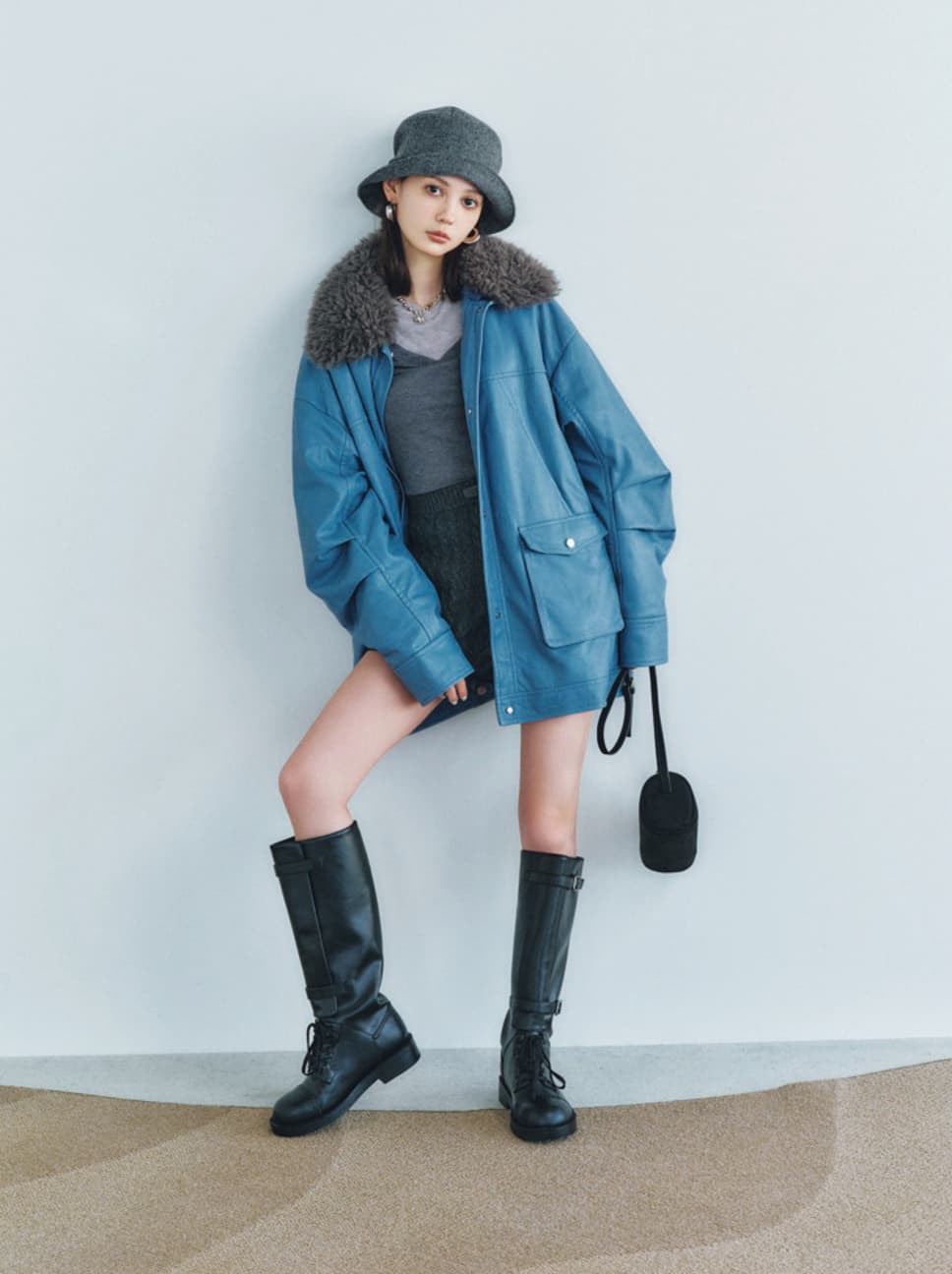ファー付きジャケット¥35200/メゾンスペシャル 青山店(メゾンスペシャル)レイヤードトップス¥22000/PARANOID ニットショートパンツ¥8800/バロックジャパンリミテッド(MOUSSY) ハット¥11000/CA4LA プレスルーム(CA4LA) ピアス¥3300/サンポークリエイト(アネモネ) ネックレス¥3300/GOLDY ミニバッグ¥6990/Gap新宿フラッグス店(Gap) ロングブーツ¥16900/CHARLES & KEITHJAPAN(CHARLES & KEITH) ●商品情報はViVi2025年12月号のものです。