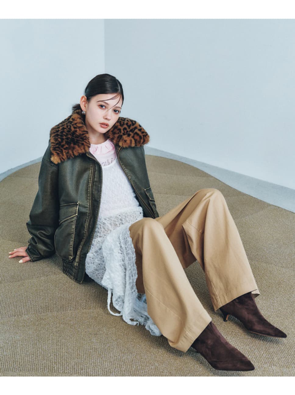 ファー付きレザーブルゾン¥22000/バロックジャパンリミテッド(SLY) レースキャミワンピース¥7920/EMODAルミネエスト新宿店 中に着ているトップス¥6930/jóuetieルミネエスト新宿店ピアス¥3190/サンポークリエイト(アネモネ)チノパン¥9790/ヘインズブランズ ジャパンカスタマーセンター(チャンピオン) ブーツ¥15950/ル タロン 有楽町マルイ店(LE TALON) ●商品情報はViVi2025年12月号のものです。
