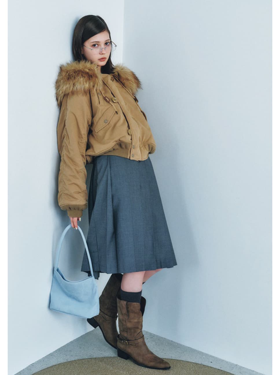 ジャケット¥27500/バロックジャパンリミテッド(MOUSSY) プリーツスカート¥15510/HANA SHOWROOM(CRANK) メガネ¥880、バッグ¥9240/HANA KOREA(mucu and ebony) ソックス¥1320/タビオ(靴下屋) ブーツ¥11000/アンティローザ(SHAGGIE)●商品情報はViVi2025年12月号のものです。