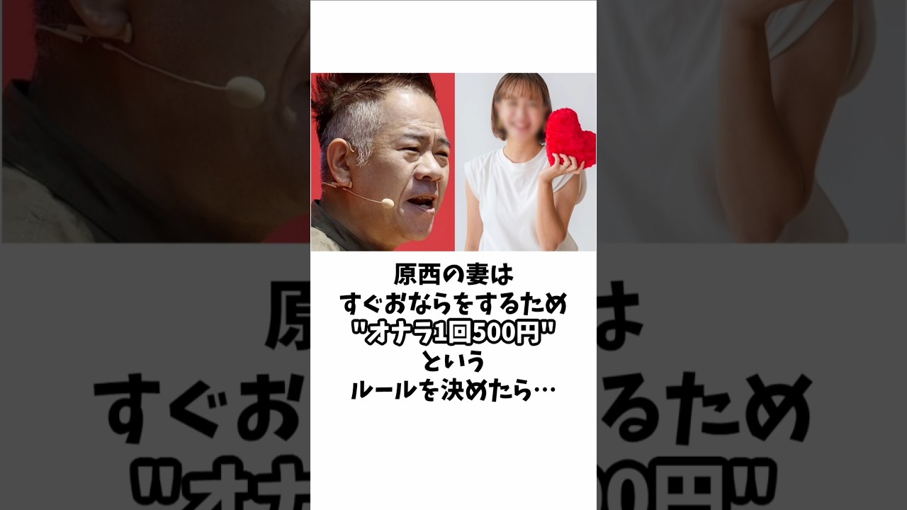 新西の妻はすぐおならをするためおなら1 回500円というルールを決めたら1ヶ月 で10万貯まったその原因は妻が4日目 から見て見てと言ってお金をチャリンと 入れてからふっとむしろ積極的におならを するようになったからそしてそのおなら 貯金で家族で焼肉を食べに行った原西はお コスが月4万だがそれでもおコスが余った 時使いきれんかったと言って妻におコスを 返すすると妻は偉いねと言って褒めて くれるため原にはそれが嬉しくて毎月 できるだけお金を使わないようにしている 妻とは元々同級生で卒業時に告白した時は 玉砕しかしそれから7年もにイベントの ドッキリ企画で同じく同級生だったフモが 妻を呼びそれがきっかけで交際結婚する ことになったそして結婚式を身内だけで 行うことになった際フ問だけは呼ぼと妻に 提案したところあの人生理的に嫌いやねん あの人が来るんやったら結婚せえへんと 言われ本当にフモ抜きで式を行ったフモは それから数ヶ月後にマネージャーから すでに式が終わっていることを知らされた