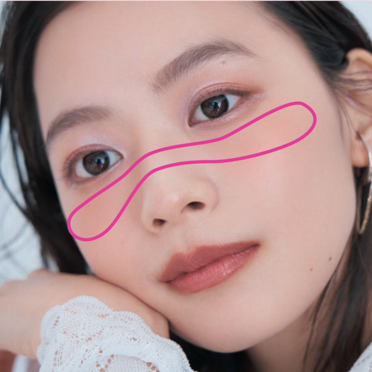 【CHEEK】Fを指でとり、頬骨の高い位置より少し内側にオン。小鼻の上までトントンと広げる。小鼻より下はスポンジでまっさらに整えて。