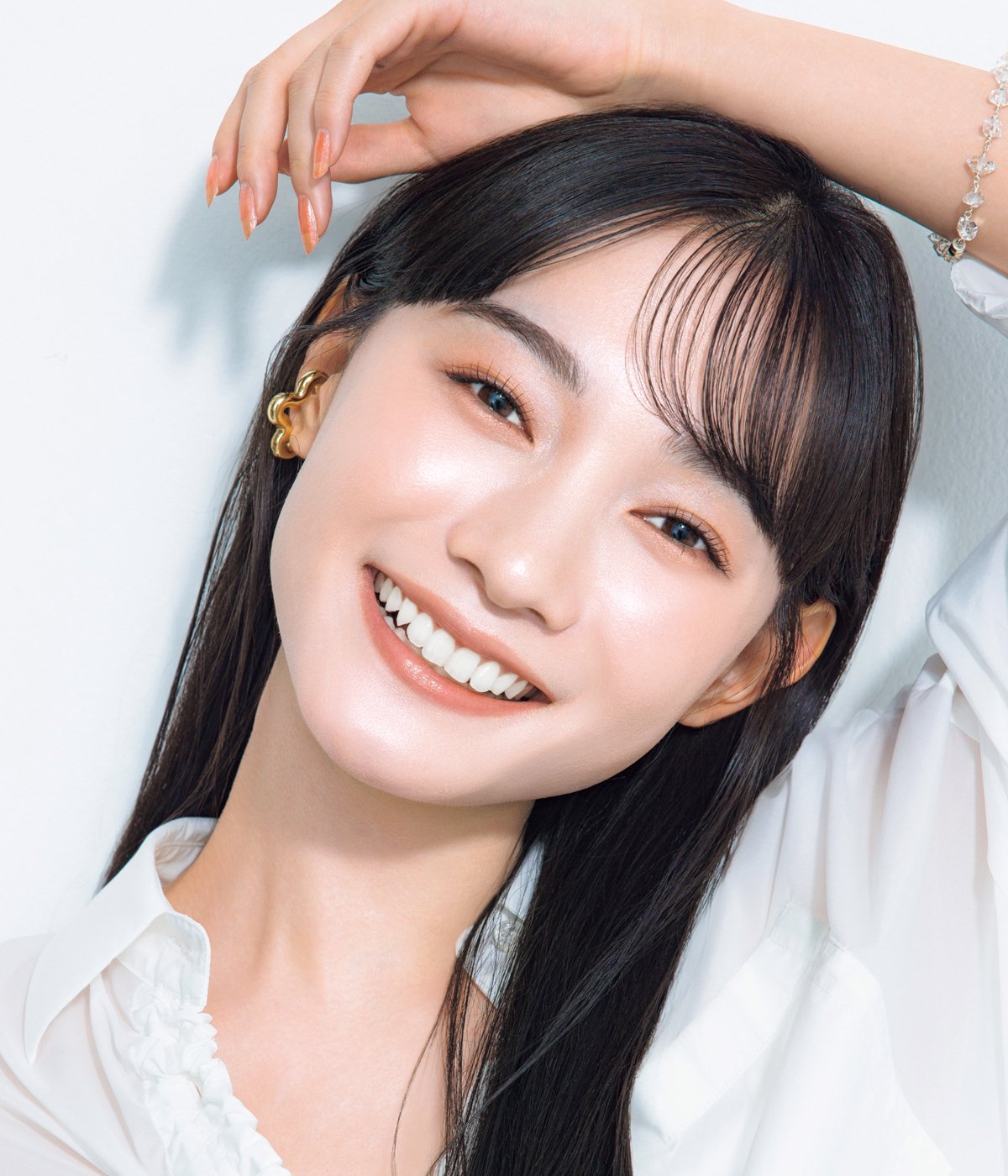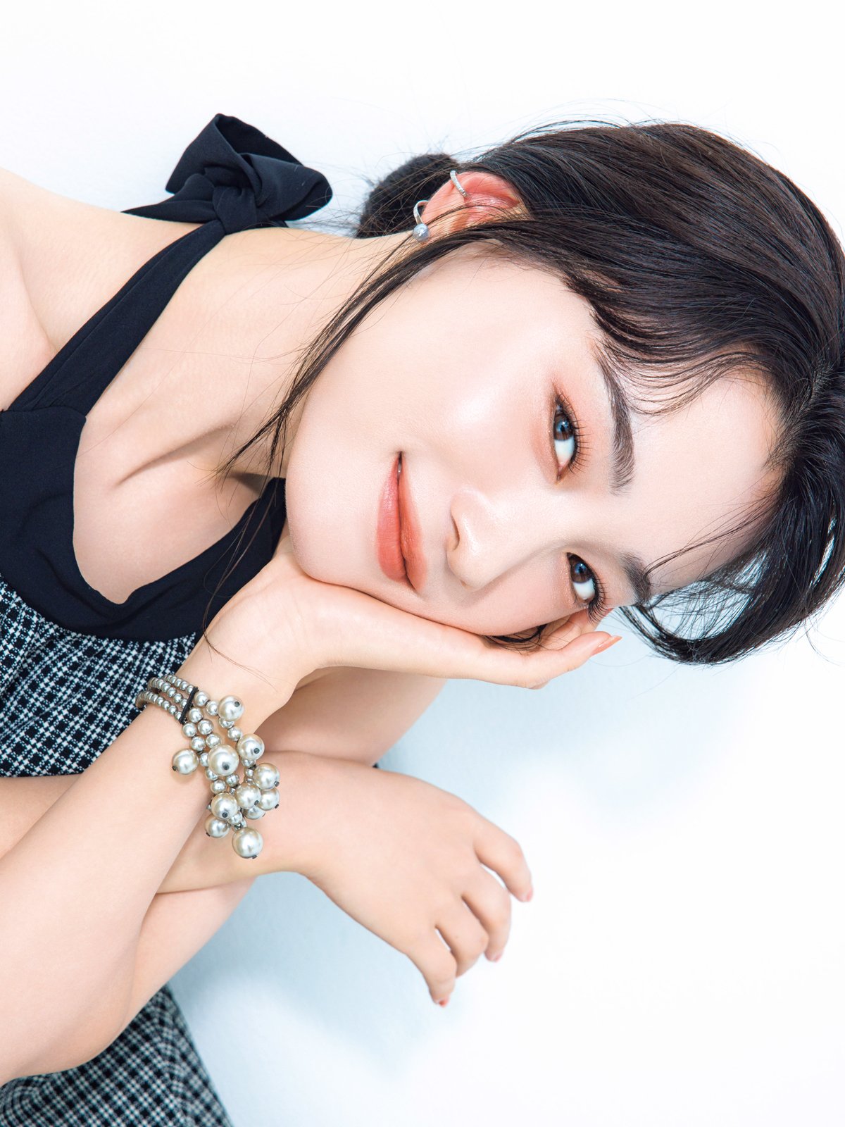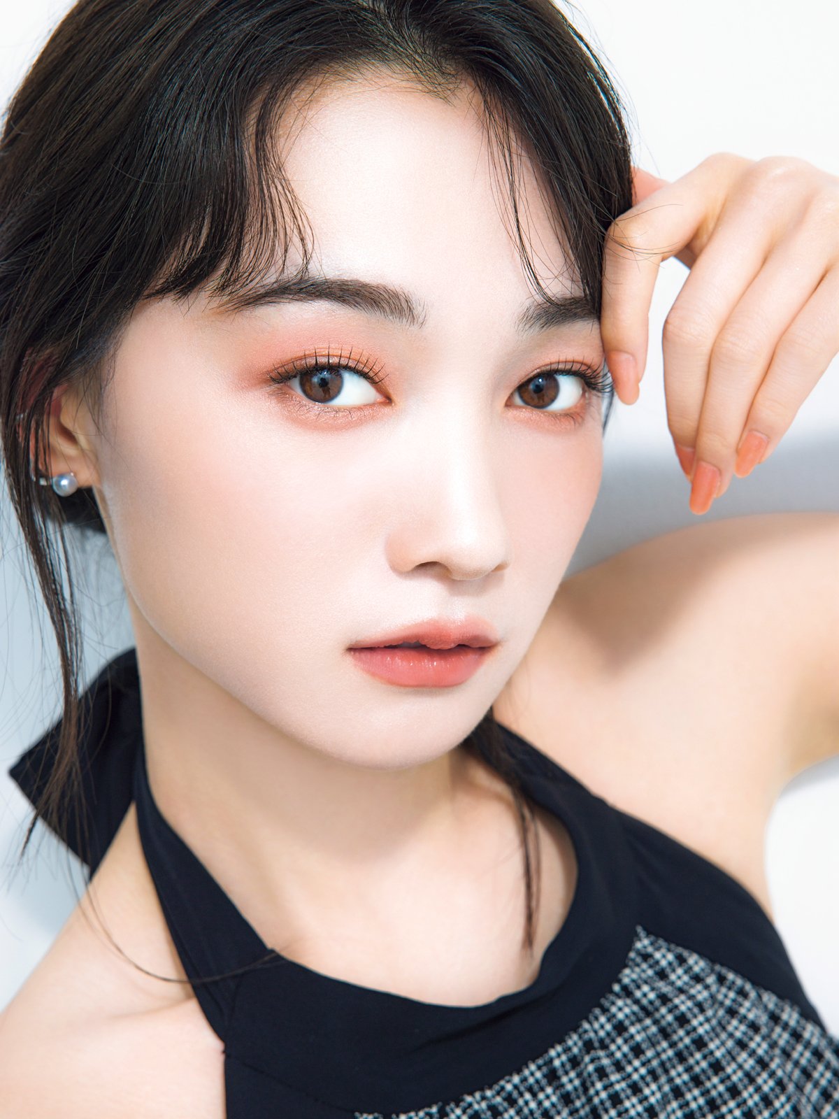 「アイシャドウで締め色を使っていないので、アイラインで自然に目ヂカラを上げると良し。まつげはボリュームよりロングで、繊細に仕上げて」
