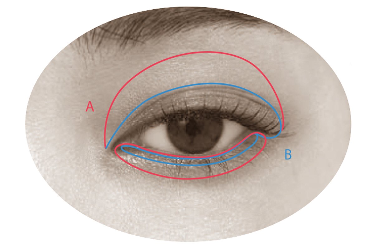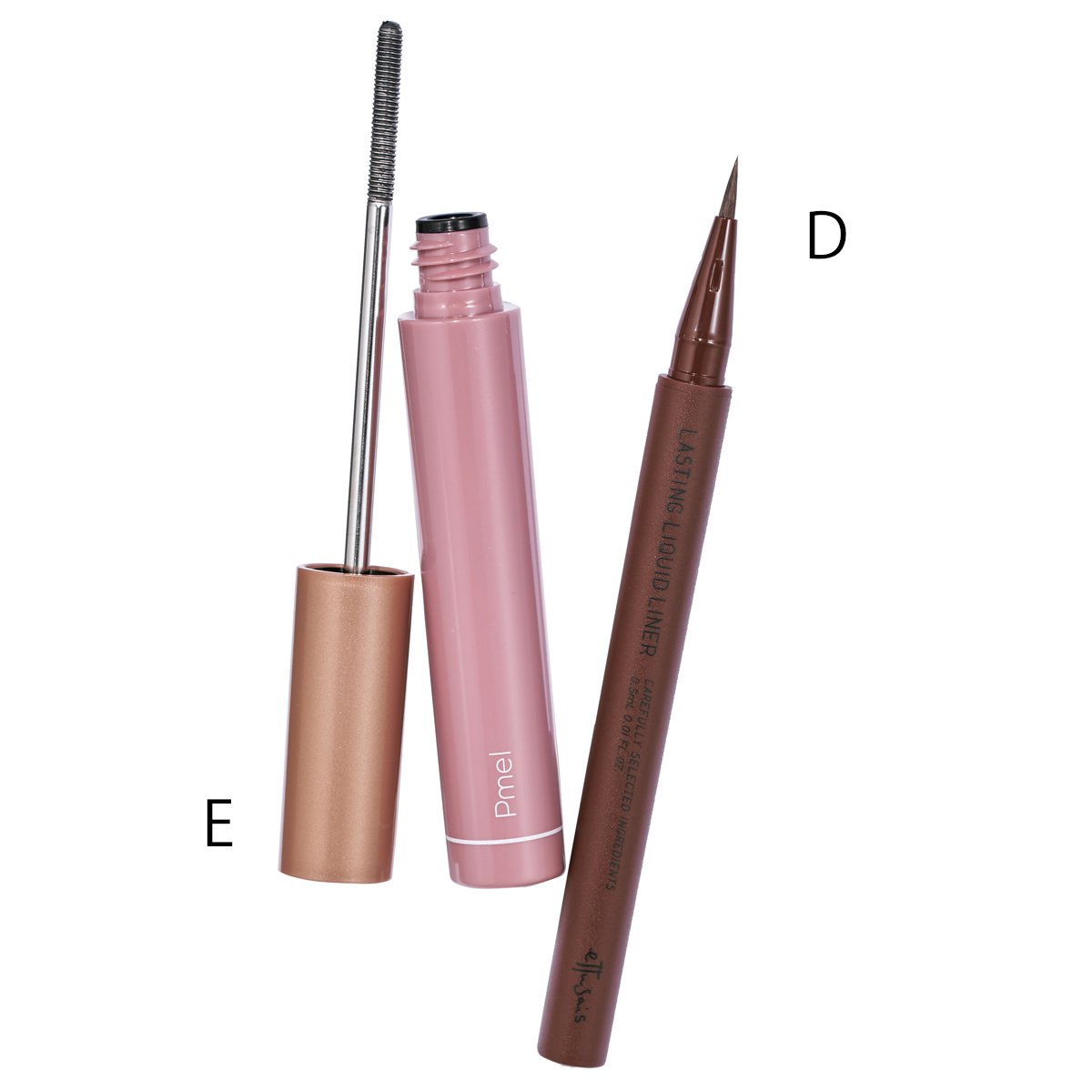 Aを指で上下まぶたにさっとひと塗り。Bを筆にとり、Aを塗った上まぶた1/2の範囲にたっぷりと重ねる。Bで下まぶたキワの目頭から目尻を埋める。ブラウンライナーで(D)上まつげキワの目頭から目尻まで埋め、目尻はスッとのばす。ブラックマスカラ(E)を上下まつげにひと塗り。