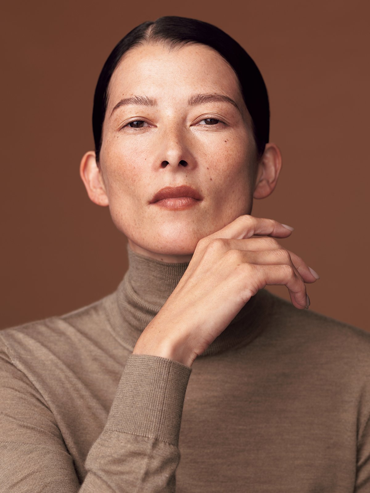オレンジ系のクリームチークを頰、こめかみ、鼻骨、唇などにラフに仕込んで。日焼け感とは違う洗練された大人のヘルシースキンが完成。