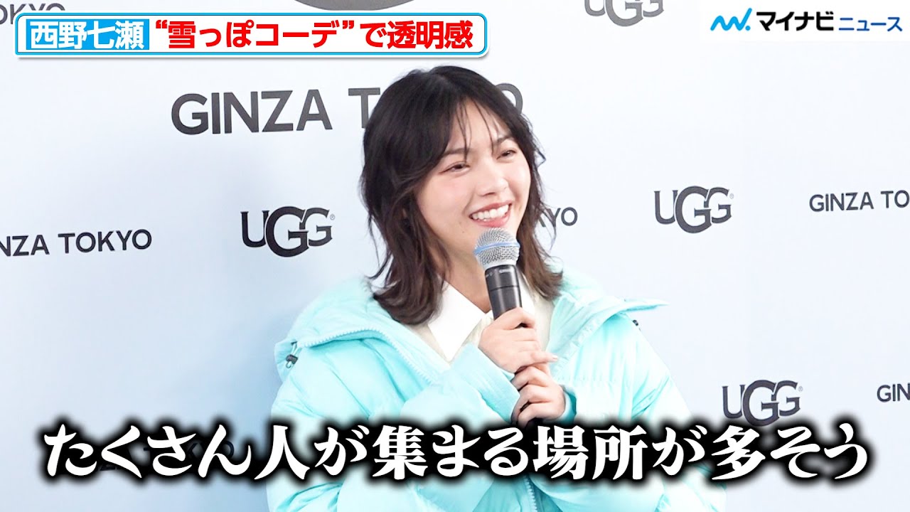 雪っぽい感じというか、こうね、たくさん人が集まる場所が多そうなので、こちら、 まずはこセッションから行わせていただきます。少々ご覧ください。 じゃあ、 少々いただきます。 はい、ありがとうございます。 大様すいません。続きまして向かって左手 が多くのカメラの方に見をいただきますか ?え、こからと見をお願いいたします。 徐々に横のカメラの方にご移動をお願いと 思います。 右手の方に目線を見せとお願いいたします 。 で、最後始当たりの方に目線お願いします 。 ありがとうございます。では続きましてムービーセッションにつきます。 じゃ、ムービーセンターのカメラお願い。 え、まずは新たに誕生したアぐ銀座也通りご覧になっていかがでしたか。 ええ、なんか今の時期ならではというかすごい掘ेで気分がなんか感じられてワクワクするような店内でアイテムもすっごいっぱいあったんですけどなんかその本当スタイリングによっていろんな提人のファッション楽しめるようなあの万能なというかなんかそういうアイテムたくさんあるなと思ってワクワクしながら 見させていただきました。 そして今日のコーディネートはホリデシーズンにぴったりのコーディネートということで、今日のポイントや意識したテーマなど教えてください。 今日そうですね、なんかあの アグの今期のそのをしているカラーが えっとイルージョンブルーっていう色味で この今履いているブーツの色味なんです けどなんかすごい爽やかでなんかま、冬 っぽいというかが可愛いのでダウも同じ ような色で全体的になんだろうちょっと雪 っっぽい感じというかはいになってるけど こうカジュアルになりすぎないようにあの シャツワンピを合わせてカジュアルダウン じゃなくてカジュアルアップ的な感じ になったらいいなというはいなんかこう雪 のフェアリー感あります。フェアリー感 ありがとうございます。はい。 なんかやっぱりカラーがアグっていうと皆さんイメージされるちょっとブラウンっぽいものが全く違うけれども そうですね。はい。 すごくでもアグってなんか分かりますよね。 はい。 うん。とっても素敵です。そのカラーのコーディネートが。 うん。可愛いですね。 え、そしてホリデーシーズンです。 はい。 顎を吐いてどこに出かけたいですか? ええ、やっぱ堀感のあるところ行きたいなとは思うんですけど、どこもこうね、たくさん人が集まる場所が多そうなので、なんかあえてそのイルミネーションをしているお家地みたいなところを散歩したいですね。 あそこの家すごいなみたいな。なんかそういうの ありますよ。 ありますよね。なんかエリアで あります。 めっちゃイルミネーションすごいお家みたいな。 結構みんなで そのエリアで 盛り上げて ていうところあるんですよね。 なんかそういうとこ発見していきたいです。 いいですね。静かに はい。 それを楽しむっていうそんな過ごし方も確かにいいかもしれませんね。 素敵なが見つかるといいですね。 はい。探したいです。 ありがとうございます。え、では以上で代表質問終わらせていただきます。西野七瀬さん、ありがとうございました。 ありがとうございました。ごいました。 あ 。
