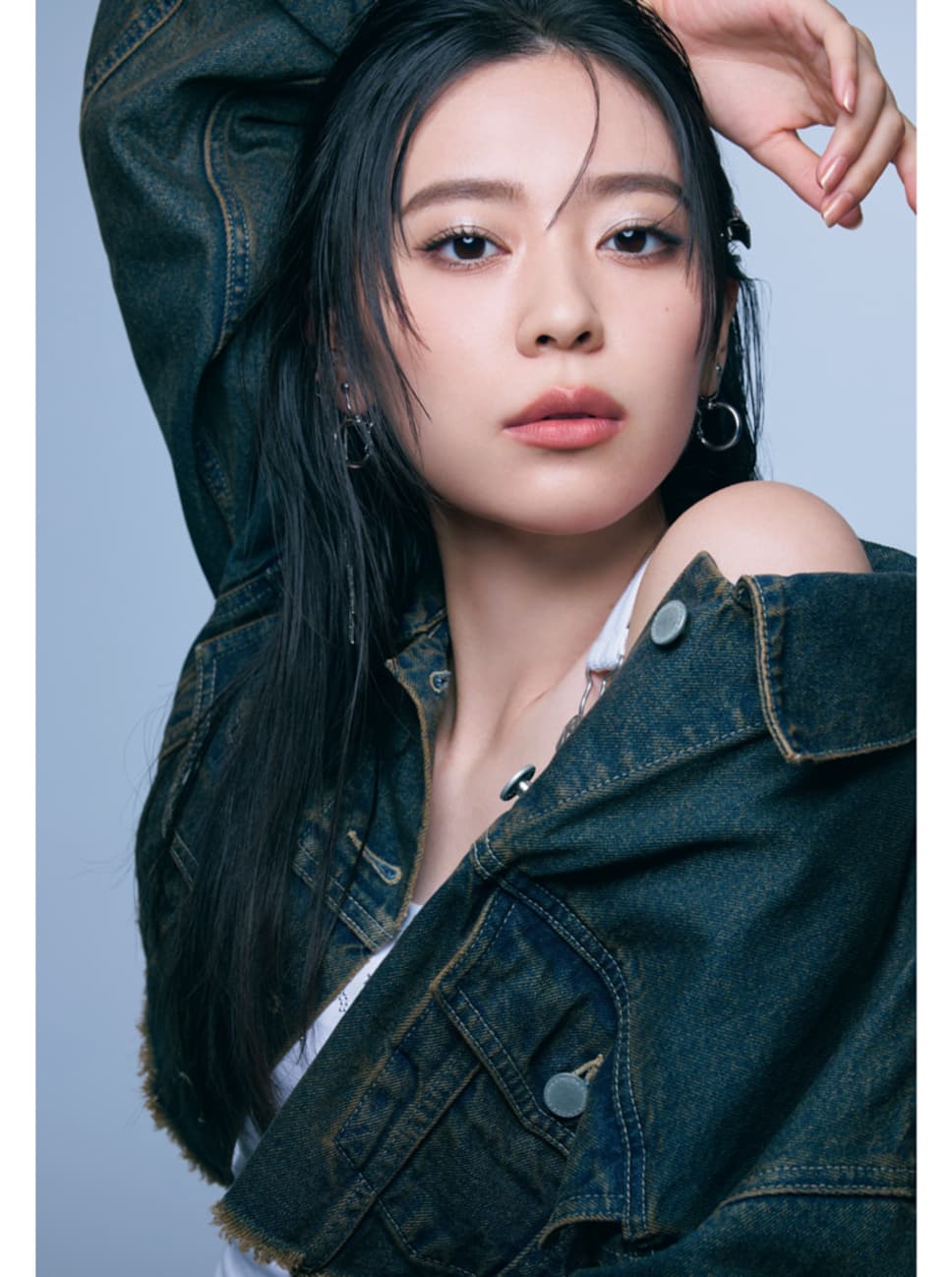 デニムジャケット¥12980、¥12980/EMODA ルミネエスト新宿 トップス¥6525/HANA SHOWROOM(ILLIGO) ヘアピン¥5280/HANA KOREA(MUSEE.ART) イヤカフ¥6820/805showroom イヤリング/スタイリスト私物 ●商品情報はViVi2025年12月号のものです。