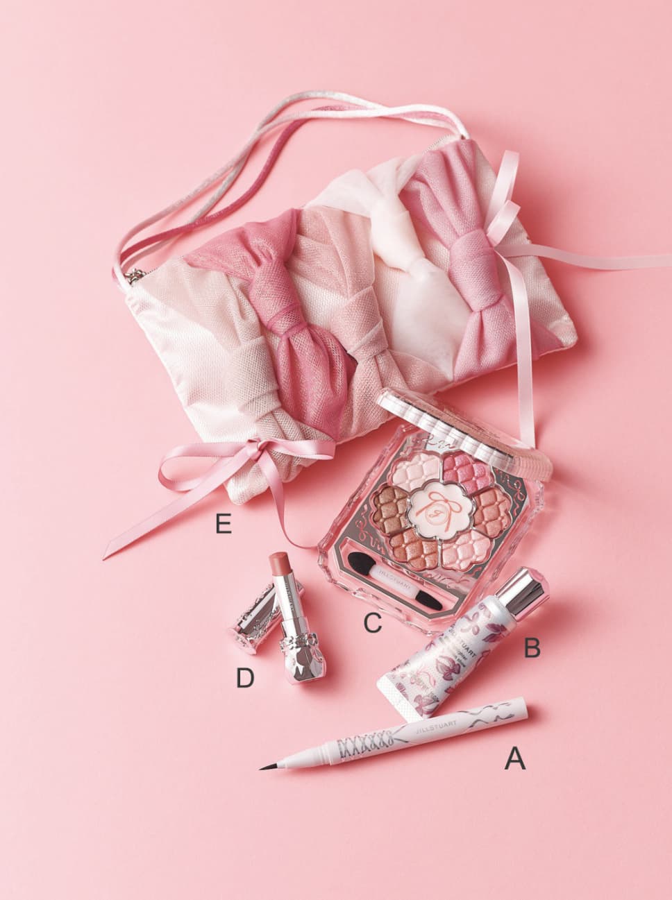 リボン ファッションショー コレクション ¥8800/ジルスチュアート ビューティ【セット内容】【A】ニュアンスルック リキッドアイライナー リボンファッションショー 【B】グロウ ハイライター リボンファッションショー 【C】ブルームクチュール アイズ リボンファッションショー 【D】リップブロッサム グロウ リボンファッションショー 【E】ポーチ ●商品情報はViVi2025年12月号のものです。