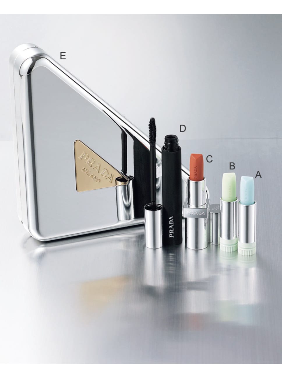 プラダ ビューティ クラッチ セット ¥25300/プラダ ビューティ【セット内容】【A】リップ バーム ブラッシング ケア U001(リフィル) 【B】同 オプティマイジング ケア U000(リフィル) 【C】モノクローム ウェイトレス リップカラー(スムース ナイロン) B101 【D】スコープ ラッシュ エクステンディング ボリューム マスカラ 【E】メタルケース ●商品情報はViVi2025年12月号のものです。
