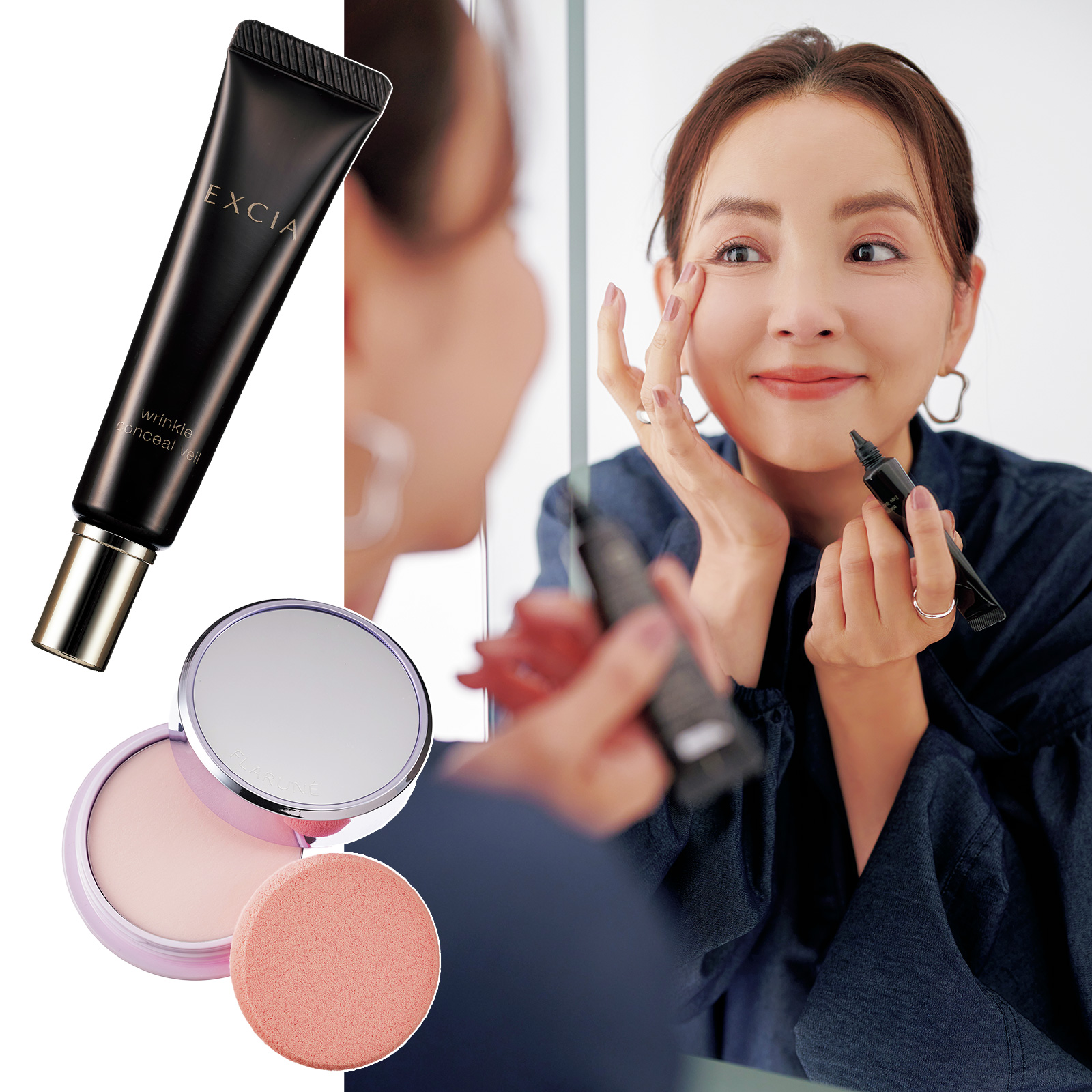 たるみの影を光で飛ばし配合のナイアシンアミドでなめらか肌に。上:エクシア リンクルコンシール ヴェールSPF18・PA++ 15g ¥6,600〈医薬部外品〉下:マットで塗る日中用保湿クリーム。フラルネ モイストリタッチ クリーム 8g ¥4,950/ともにアルビオン