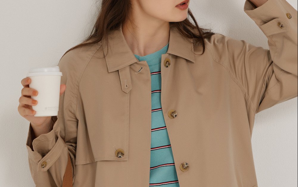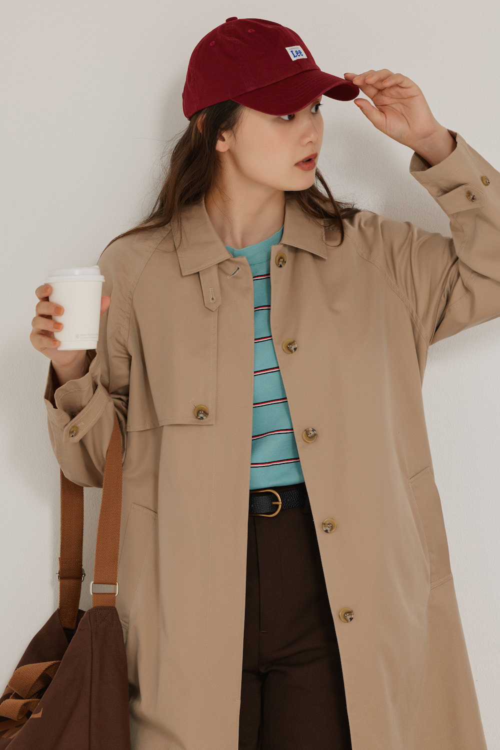 「トレンチコートの中から、チョコミントのようなカラーのロングTシャツをのぞかせて、大人しくなりがちな秋色コーデに華やぎをトッピング。Tシャツの赤を拾って、小物をチョイスすると、全体がまとまって、きちんとした印象に」