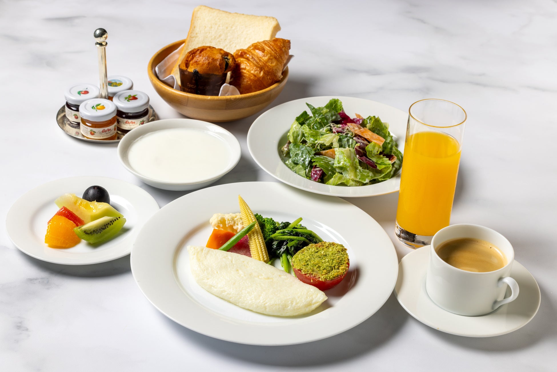 ホワイトオムレツなど美容とウェルネスを意識したメニューがセットとなった「ヘルシーブレックファスト」、または、約50種類以上のメニューがそろう「ブレックファスト ビュッフェ」よりお選びいただけます。