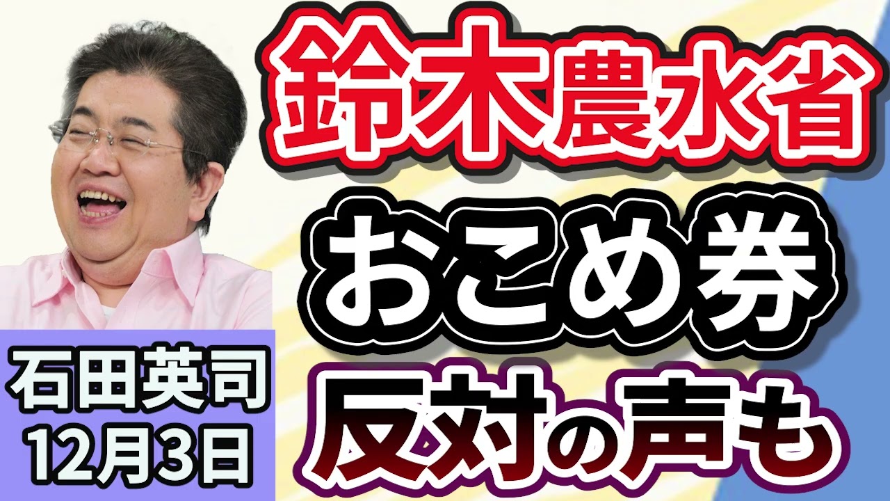 ここからは石田エジさんでございます。おはようございます。よろしくお願いします。 まずはこちらからです。 自治体向けにお米の説明会です。今日からスタートです。え、鈴木農林審査大臣は 11月28 日総合経済対策に物価高川対策として盛り込みましたお米に関しまして、え、今日 3 日から地方自治体向けのオンライン説明会を開催すると明らかにしました。 で、鈴木大臣はですね、担当者からの問い合わせが相ついでいるということで裏付けとなる補正予算の成立を待たずに、ま、様々な情報をまず事前に共有させてもらいたいと述べたということなんですが、とこ一部の自治体からはね、反発の声も上がってるということで、じゃ、このお米は一体どんなものなのかというとこですよね。あの、反発するんのもおかしくてね。うん。 うん。 あの、元々、ま、経済対策の中の 2兆円分を 各自治体が、ま、好きに使える。 はい。 え、重点支援地方校府保険という形にするんですけども、 2 兆円はそれが予算取りしますよと。そのうちのさらに 4000億円を、 ま、形で、ま、1人うん。 ま、国民1人にし3000 円ぐらいなんですよ。 はい。 3000 円ぐらいを、ま、え、ろんなやり方でクーポンとか剣とか配ったらどうですか?ていうのがまずあるわけ。 はい。はい。 で、例えば、ま、地域進行権的なものでもいいし、え、ま、そうやな。 あんまり商品権で聞いたことないけど、ま、お米も 1 つですよということなんだけども、プレミアム商品って昔からあるよね。 ありますね。 で、え、申、あとお県ってのもありますよって言うた時に うん。 え、自治らの人がこれ鈴木大臣が言うてけどおこ県っていうのを知らない人がいらっしゃると。 あ、し、知らない。 知らない。 うん。 つまりそういうもんがあるということをご存知ない首長さんというかそのいらっしゃると でそれは自分とこですらなあかんのですかと。 ああはいはいはい。 いやいやちゃいます。すでにありまんねやでと。え、そうなんですかということやったらま、そうやったらちょっとこのお米ちゅうのを説明させてもらいますということで今日から、 え、各地で 説明会開く、あの、それ言うても地方に足元の基礎したいとかなってくるとそれ数ものすごいありますから米自分とこ作ってたやろし。 そう、そう、そうですよね。米使える店がそのなにその事態の中にあると思えない。 で、あの、おっしゃる通り、あの、配ろうとするとね。で、それうちとこで用意したきませんの?え、それとも、え、なんか原送ってもらえますの。 そう、そう、そう、そう、そう。 ありますよね。 そうなんです。いや、で、ま、説明しますたということなんですけども、お米我々はよく目にしますよね。 あ、でもあれどうですか?最近って あり使ってらっしゃいます。 うん。 ま、チケットたらあるし、あの、看板うち使えますよ。看板なんかなんちゅうの鉄のあの看板みたいな なんか商店の ぶってるよ。 あの、昔よくそのなんかね、あのお祝いとか渡す時にお米とかビール県とか大便日本換算できますとかあった。 そう、そう、そう。で、実はま、色々ま大臣も言うて別にお米ま県せいて言ってるわけますよといろんな中の 1 つにおま県っていうのもありますよもんで。うん。 うん。 論からとね、お米が実は番ふわしくないと思ってて、今日こんなしたいんですけど、 え、別にお米に恨みがあるわけないですけど、お米のね、立付けがね、こういうものに向いてへんということを言いたい。 お、 お米できたのが1983 年ですから、僕は大学の、 ああ、 え、4 年生かそ、それぐらいです。ま、だから俺が学校はそう、あんまりないっちゅうことでさ、 なかったけどうん。出る頃にあった。 うん。 うん。で、 僕らのとこありましたよね。大学生 そうです。あったでしょ。で、 この米お米のおろし売り業者さんで作る、え、全国米、あ、米国販売事業共同区面、要はお米のおろし売り業者さんで作る組み合いが うん。うん。 最初に出した。 はい。 で、その後農も出した。 うん。 で、実は半、 米阪共同組合の うん。 あ、ちゃうわ。全国米国米半やな。 はい。はい。はい。のが大体中の 8割を占めるらしいです。で、農の分が 2割らしいです。 ああ、でも使う方ってそこはあまり意識してない。意識で意識でま、一緒やからね。使えるの店は一緒やからね。 ほんで この全国共通お米券なんですが 1枚500円です。 おお。はい。はい。 ね。例えば5000円人に送るんやったら 10枚買。500円は10 枚。はい。なるほど。うん。 で、500円なんですが 440円分のお米しか買えません。 うん。え。そ、そこ手数料かかるんです。 60 円。 へえ。結構かかるな。 これが60 円っていうのがその、ま、発酵手数量であるとか、ま、流通手数料であるとか、ま、諸々ろの手数料として 500円の件の中から60 円はもうだきますよと。 うん。 で、残りの440 円がお米になりますという件なんですよ。 うん。うん。 で、