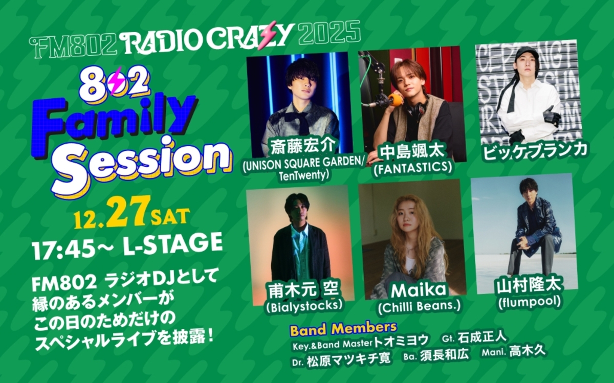 FM802が毎年年末に開催するロック大忘年会”FM802 RADIO CRAZY”。このたび12月27日17時45分からL STAGEに登場する”802 Family Session”の出演者が決定した。
