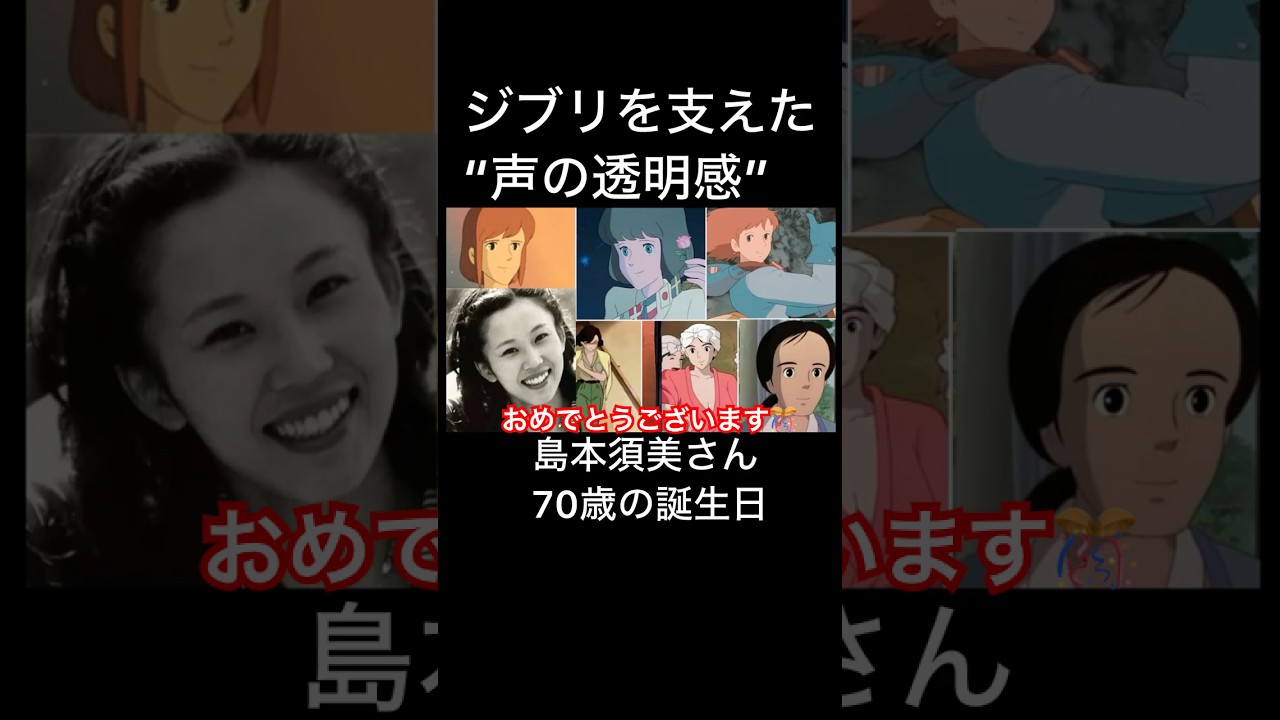 今日70歳の誕生日を迎えた島本住さん。 渋い作品の空気を決めた最重要優さんの 1人です。彼女が演じたのはナウシカ。 ルパン3世カリオストロの城のクラリス隣 のトトロのお母さん物の姫のおさんなど 多数宮崎はおは島本さんの声についてこう 語っています。透明でまっすぐで人を救う 力がある声だ。実際島本住の透明官は ジブリのテーマと直結するナウシカの 慈悲深さ、フライスの純粋さ、トトロ お母さんの優しさ、おさんの強さ、どの キャラも魅力的だ。宮崎はおの初期ぶりに は優しさと強さの物語がある。その中心に いつも島本さんの声があった。彼女の声が なかったらりの記憶は全く違う形になって いたはず。熊本さん、その声はちブりの心 そのもの誕生日おめでとうございます。 [音楽]