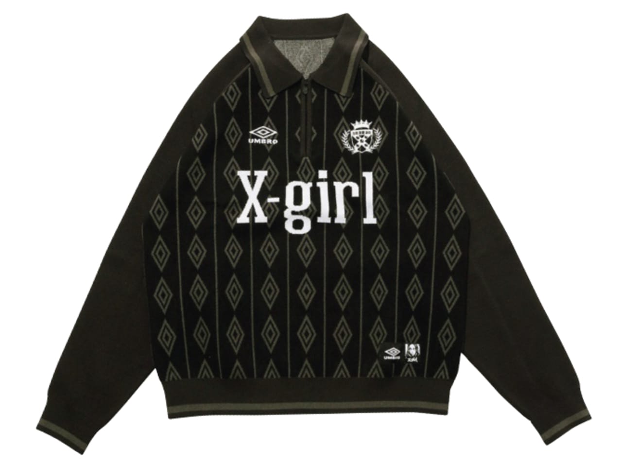 フットボールブランドUMBROとViVi世代に大人気のX-girlのコラボアイテムはハーフジップ仕様の長袖ニットトップス。ゲームシャツのデザインをジャカード織りしたトレンドライクなデザインで、UMBROロゴの総柄がスタイリングのアクセント。