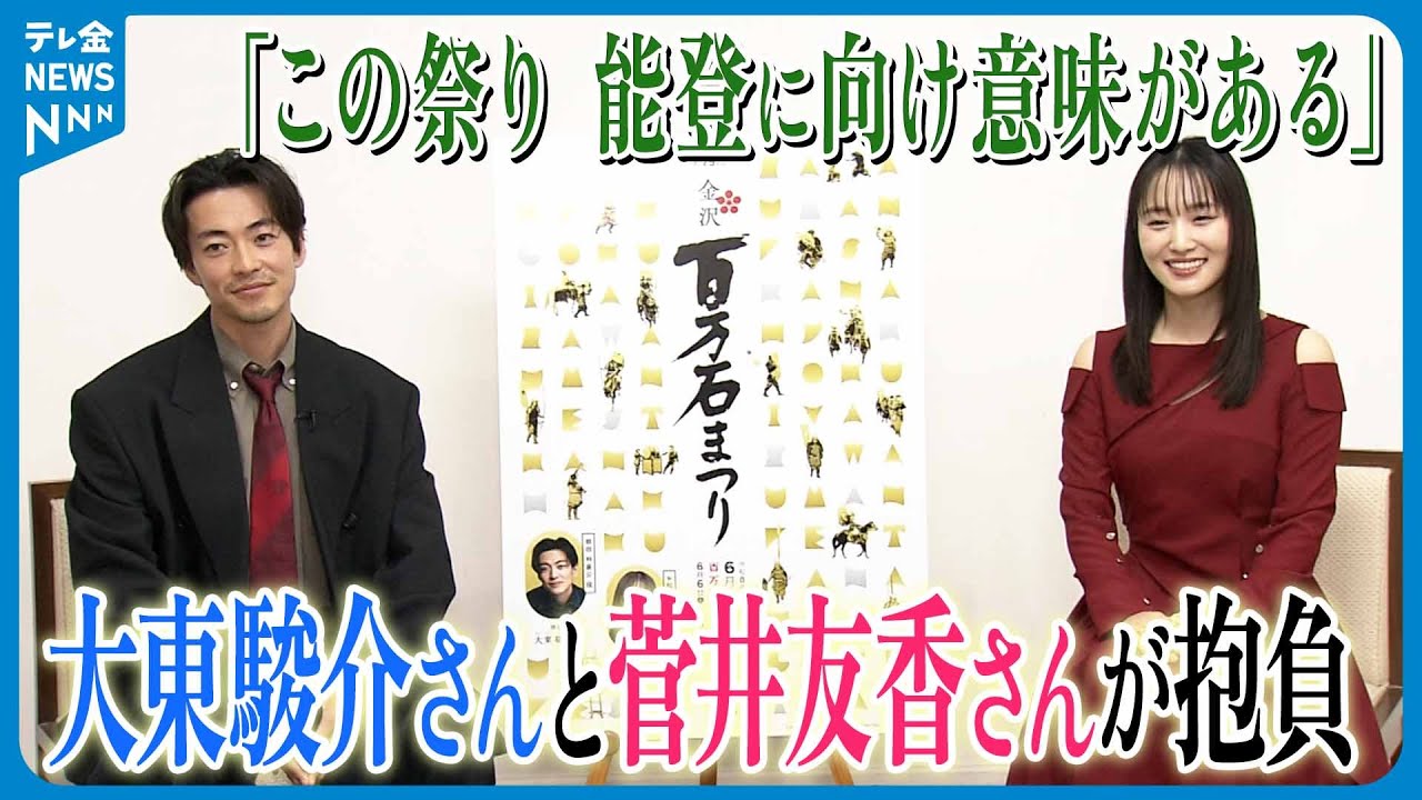 東京都内で行われた記者会見。来年の 大ガドラマでそれぞれ前田とお松の方を 演じることから今回の行列の拝が決まった 俳優の大東俊介さんと菅優香さんが思いを 語りました。駅人物の中でも年家っていう のは、ま、僕も1つ憧れの 、え、人物だったので、ま、それが決まっ た時に嬉しかったんですが、ちょっと薄う 100万国祭り呼んでいただけるんじゃ ないかなっていう淡い期待をしていた ところに本当にこのお話をいただいて 嬉しかったですね。 地元の方とかと温かさとかや文化が気づく 街並にすごく感動してあのね大好きになっ たので金沢が100万国祭りにマとして 出演させていただけると聞いてとっても夢 のようでした。 また菅さんは馬術が得意だと言いますが、 100万国祭りでは馬に乗るのは大東さん のみでもまずもあのそういう場並み もあったと思うのであの技術は持てたん じゃないかなって思います。乗りたいよな 。乗りたいですね。きっと年と乗ってた こともあるのかなとイメージすると乗り たい思いますね。そまで行かしていただ。 そして大さんが例年の観覧人数について聞くと 45万人 45万人 すごい 45 万人ですか?多すぎてよくわかんない。 それだけこう前田という人物、年江と待 つっていう人物が金沢でも愛されているし 、あと元々そのこの100万国祭 りっていうのが戦後の復興をのために、ま 、その金沢の人たちをこう背中押すために 始まった祭りということで、今まさにもう 元でもまだ大変な思いをしてらっしゃる方 いらっしゃると思うので、まさに復興本来 このお祭りが持ってる意味っていうのも今 まさにあるんじゃないかなと思っているの で、ま、それが今回の大ガドラマ と一緒にこの日本で盛り上げていけたら いいなという思いも持って参加させて いただきたいなと思ってます。はい。 当日は大雅と同じ衣装とメイクで行列に 参加することになっているというお2人。 石川、そして全国へ 100 万国の歴史と文化を届けてくれることに期待です。